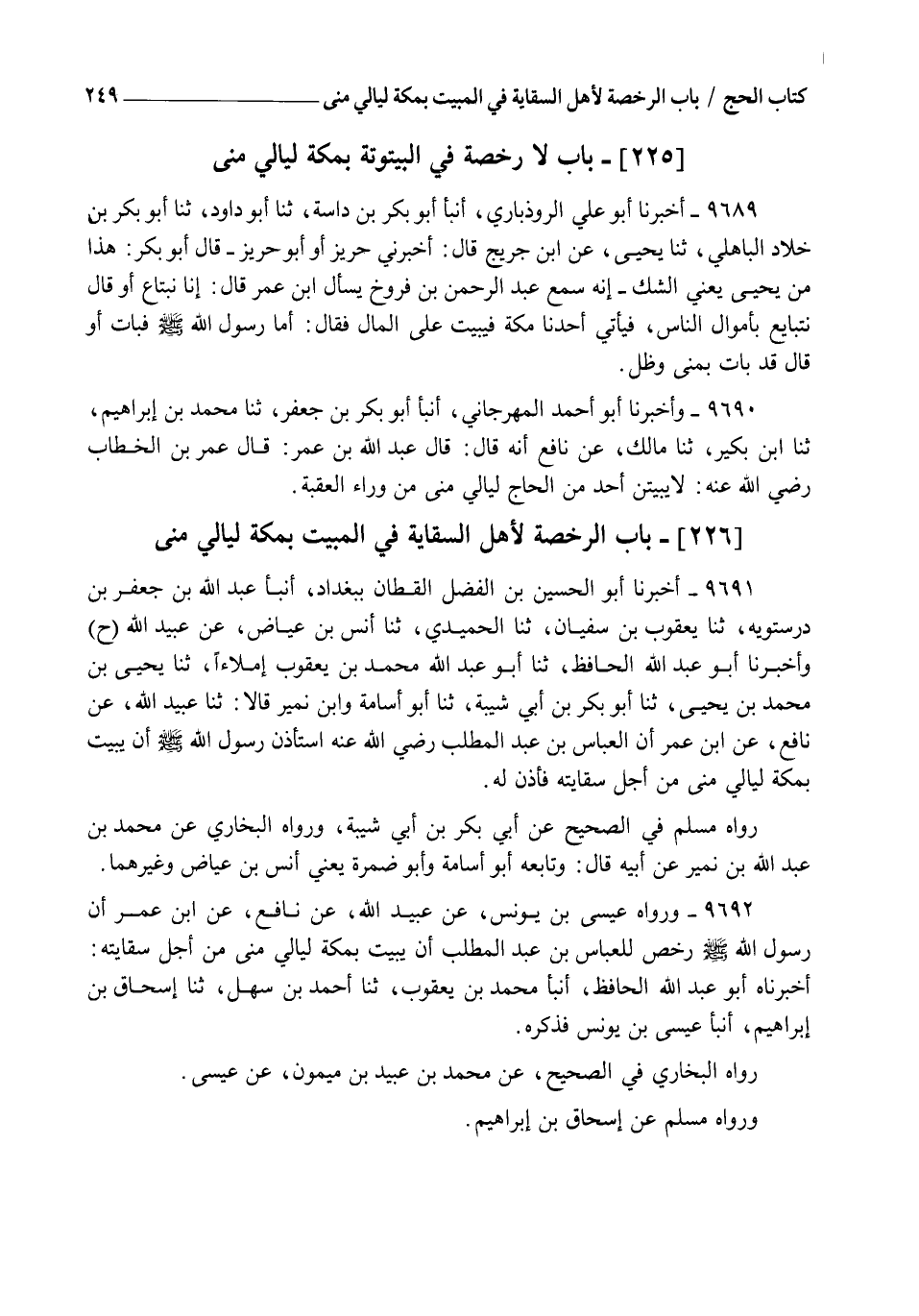 9691 - أَخْبَرَنَا أَبُو الْحُسَيْنِ بْنُ الْفَضْلِ الْقَطَّانُ , بِبَغْدَادَ , أنبأ عَبْدُ اللهِ بْنُ جَعْفَرِ بْنِ دَرَسْتَوَيْهِ , ثنا يَعْقُوبُ بْنُ سُفْيَانَ , ثنا الْحُمَيْدِيُّ , ثنا أَنَسُ بْنُ عِيَاضٍ , عَنْ عُبَيْدِ اللهِ , ح وَأَخْبَرَنَا أَبُو عَبْدِ اللهِ الْحَافِظُ , ثنا أَبُو عَبْدِ اللهِ مُحَمَّدُ بْنُ يَعْقُوبَ إِمْلَاءً , ثنا يَحْيَى بْنُ مُحَمَّدِ بْنِ يَحْيَى , ثنا أَبُو بَكْرِ بْنُ أَبِي شَيْبَةَ , ثنا أَبُو أُسَامَةَ , وَابْنُ نُمَيْرٍ قَالَا: ثنا عُبَيْدُ اللهِ , عَنْ نَافِعٍ , عَنِ ابْنِ عُمَرَ " أَنَّ الْعَبَّاسَ بْنَ عَبْدِ الْمُطَّلِبِ رَضِيَ اللهُ عَنْهُ §اسْتَأْذَنَ رَسُولَ اللهِ صَلَّى اللهُ عَلَيْهِ وَسَلَّمَ أَنْ يَبِيتَ بِمَكَّةَ لَيَالِيَ مِنًى مِنْ أَجْلِ سِقَايَتِهِ , فَأَذِنَ لَهُ " , رَوَاهُ مُسْلِمٌ فِي الصَّحِيحِ عَنْ أَبِي بَكْرِ بْنِ أَبِي شَيْبَةَ , وَرَوَاهُ الْبُخَارِيُّ عَنْ مُحَمَّدِ بْنِ عَبْدِ اللهِ بْنِ نُمَيْرٍ , عَنْ أَبِيهِ , قَالَ: وَتَابَعَهُ أَبُو أُسَامَةَ وَأَبُو ضَمْرَةَ يَعْنِي أَنَسَ بْنَ عِيَاضٍ وَغَيْرُهُمَا