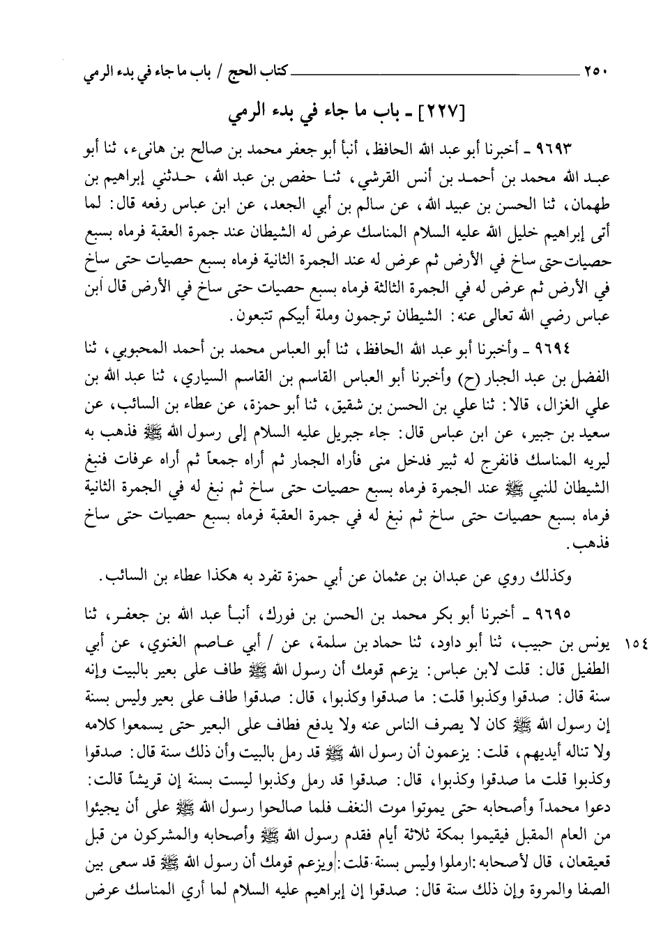 9693 - أَخْبَرَنَا أَبُو عَبْدِ اللهِ الْحَافِظُ , أنبأ أَبُو جَعْفَرٍ مُحَمَّدُ بْنُ صَالِحِ بْنِ هَانِئٍ , ثنا أَبُو عَبْدِ اللهِ مُحَمَّدُ بْنُ أَحْمَدَ بْنِ أَنَسٍ الْقُرَشِيُّ , ثنا حَفْصُ بْنُ عَبْدِ اللهِ , حَدَّثَنِي إِبْرَاهِيمُ بْنُ طَهْمَانَ , ثنا الْحَسَنُ بْنُ عُبَيْدِ اللهِ , عَنْ سَالِمِ بْنِ أَبِي الْجَعْدِ , عَنِ ابْنِ عَبَّاسٍ رَفَعَهُ , قَالَ: " لَمَّا §أَتَى إِبْرَاهِيمُ خَلِيلُ اللهِ عَلَيْهِ السَّلَامُ الْمَنَاسِكَ عَرَضَ لَهُ الشَّيْطَانُ عِنْدَ جَمْرَةِ الْعَقَبَةِ فَرَمَاهُ بِسَبْعِ حَصَيَاتٍ حَتَّى سَاخَ فِي الْأَرْضِ , ثُمَّ عَرَضَ لَهُ عِنْدَ الْجَمْرَةِ الثَّانِيَةِ فَرَمَاهُ بِسَبْعِ حَصَيَاتٍ حَتَّى سَاخَ فِي الْأَرْضِ , ثُمَّ عَرَضَ لَهُ فِي الْجَمْرَةِ الثَّالِثَةِ فَرَمَاهُ بِسَبْعِ حَصَيَاتٍ حَتَّى سَاخَ فِي الْأَرْضِ " قَالَ ابْنُ عَبَّاسٍ رَضِيَ اللهُ تَعَالَى عَنْهُ: " الشَّيْطَانَ تَرْجُمُونِ , وَمِلَّةَ أَبِيكُمْ تَتَّبِعُونَ "
