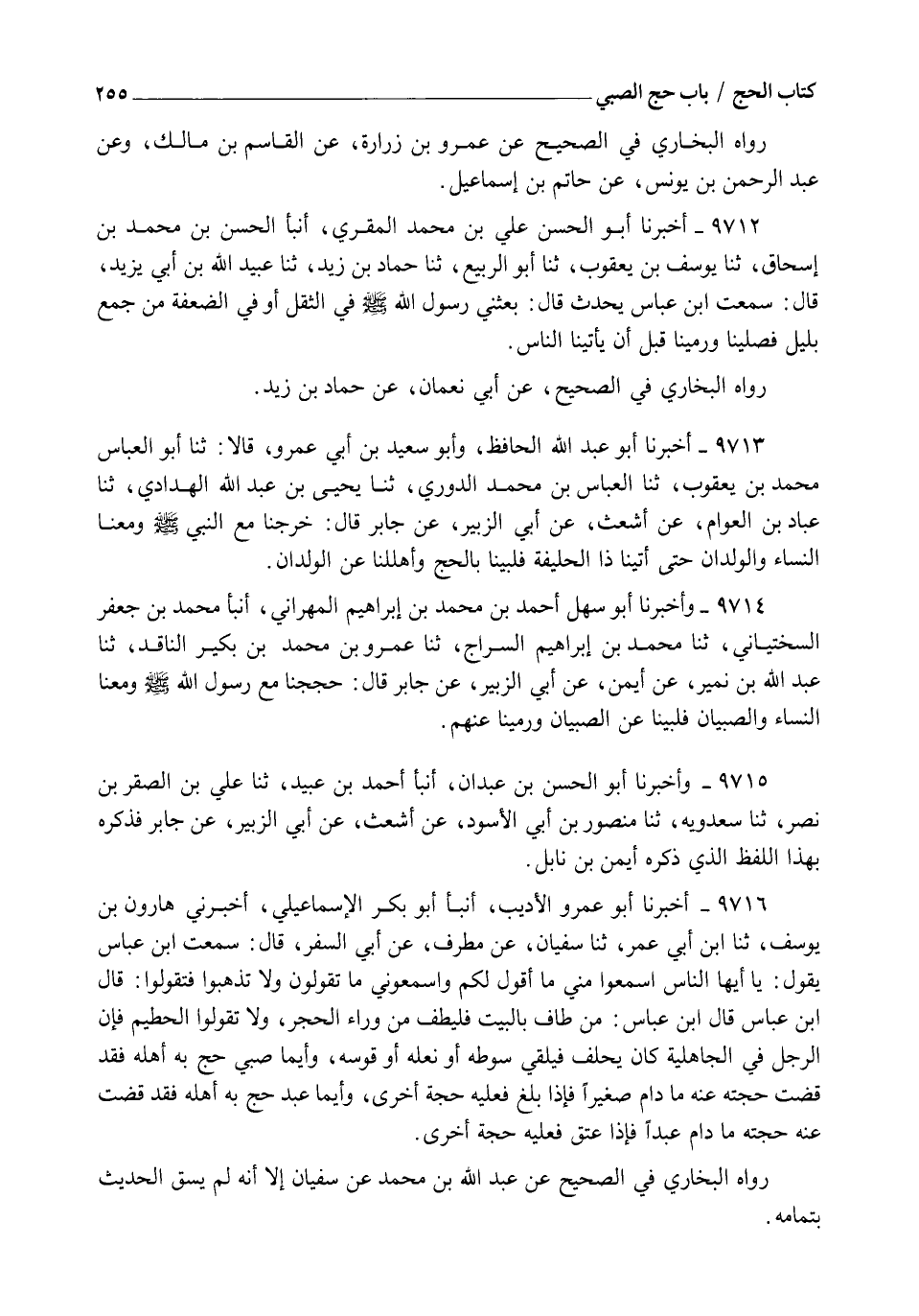 9716 - أَخْبَرَنَا أَبُو عَمْرٍو الْأَدِيبُ , أنبأ أَبُو بَكْرٍ الْإِسْمَاعِيلِيُّ , أَخْبَرَنِي هَارُونُ بْنُ يُوسُفَ , ثنا ابْنُ أَبِي عُمَرَ , ثنا سُفْيَانُ , عَنْ مُطَرِّفٍ , عَنْ أَبِي السَّفَرِ , قَالَ: سَمِعْتُ ابْنَ عَبَّاسٍ , يَقُولُ: " يَا أَيُّهَا النَّاسُ , اسْمَعُوا مِنِّي مَا أَقُولُ لَكُمْ وَأَسْمِعُونِيُّ مَا تَقُولُونَ وَلَا تَذْهَبُوا فَتَقُولُوا: قَالَ ابْنُ عَبَّاسٍ , قَالَ ابْنُ عَبَّاسٍ: §مَنْ طَافَ بِالْبَيْتِ فَلْيَطُفْ مِنْ وَرَاءِ الْحِجْرِ وَلَا تَقُولُوا: الْحَطِيمُ فَإِنَّ الرَّجُلَ فِي الْجَاهِلِيَّةِ كَانَ يَحْلِفُ فَيُلْقِي سَوْطَهُ , أَوْ نَعْلَهُ , أَوْ قَوْسَهُ , وَأَيُّمَا صَبِيٍّ حَجَّ بِهِ أَهْلُهُ فَقَدْ قَضَتْ حَجَّتُهُ عَنْهُ مَا دَامَ صَغِيرًا , فَإِذَا بَلَغَ فَعَلَيْهِ حَجَّةٌ أُخْرَى , وَأَيُّمَا عَبْدٍ حَجَّ بِهِ أَهْلُهُ , فَقَدْ قَضَتْ عَنْهُ حَجَّتُهُ مَا دَامَ عَبْدًا فَإِذَا عَتَقَ فَعَلَيْهِ حَجَّةٌ أُخْرَى " رَوَاهُ الْبُخَارِيُّ فِي الصَّحِيحِ عَنْ عَبْدِ اللهِ بْنِ مُحَمَّدٍ , عَنْ سُفْيَانَ إِلَّا أَنَّهُ لَمْ يَسُقِ الْحَدِيثَ بِتَمَامِهِ -[256]- وَقَدْ رُوِّينَا فِيمَا مَضَى حَدِيثَ أَبِي ظَبْيَانَ , عَنِ ابْنِ عَبَّاسٍ مَوْقُوفًا ومَرْفُوعًا فِي حَجِّ الصَّبِيِّ وَغَيْرِهِ