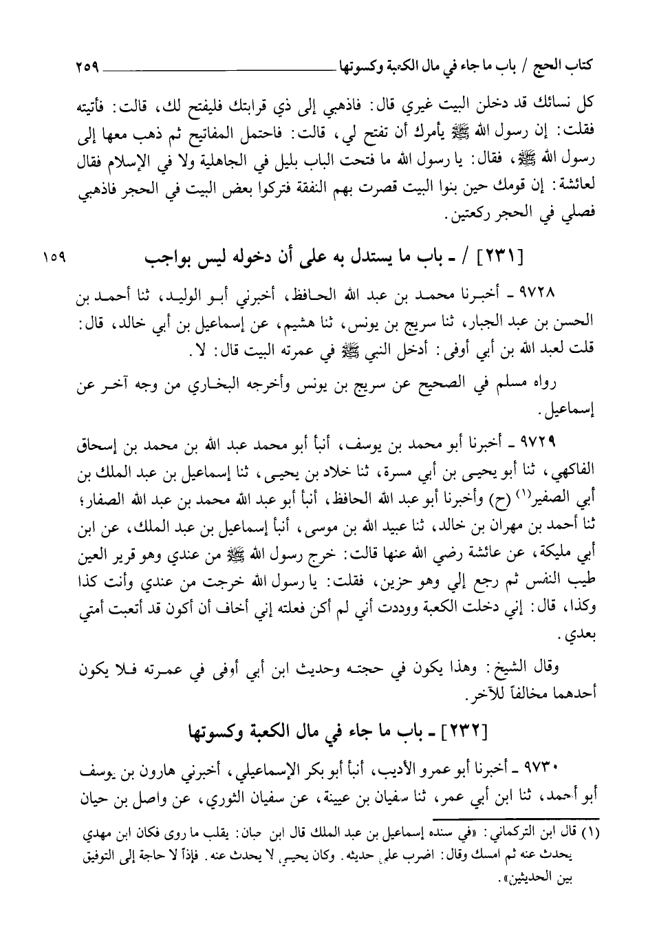 9729 - أَخْبَرَنَا أَبُو مُحَمَّدِ بْنُ يُوسُفَ , أنبأ أَبُو مُحَمَّدٍ عَبْدُ اللهِ بْنُ مُحَمَّدِ بْنِ إِسْحَاقَ الْفَاكِهِيُّ , ثنا أَبُو يَحْيَى بْنُ أَبِي مَسَرَّةَ , ثنا خَلَّادُ بْنُ يَحْيَى , ثنا إِسْمَاعِيلُ بْنُ عَبْدِ الْمَلِكِ بْنُ أَبِي الصِّفَيْرِ , ح وَأَخْبَرَنَا أَبُو عَبْدِ اللهِ الْحَافِظُ , أنبأ أَبُو عَبْدِ اللهِ مُحَمَّدُ بْنُ عَبْدِ اللهِ الصَّفَّارُ , ثنا أَحْمَدُ بْنُ مِهْرَانَ بْنِ خَالِدٍ , ثنا عُبَيْدُ اللهِ بْنُ مُوسَى , أنبأ إِسْمَاعِيلُ بْنُ عَبْدِ الْمَلِكِ , عَنِ ابْنِ أَبِي مُلَيْكَةَ , عَنْ عَائِشَةَ , رَضِيَ اللهُ عَنْهَا , قَالَتْ: خَرَجَ رَسُولُ اللهِ صَلَّى اللهُ عَلَيْهِ وَسَلَّمَ مِنْ عِنْدِي وَهُوَ قَرِيرُ الْعَيْنِ طَيِّبُ النَّفْسِ ثُمَّ رَجَعَ إِلِيَّ وَهُوَ حَزِينٌ فَقُلْتُ: يَا رَسُولَ اللهِ خَرَجْتَ مِنْ عِنْدِي وَأَنْتَ كَذَا وَكَذَا , قَالَ: §" إِنِّي دَخَلْتُ الْكَعْبَةَ وَوَدِدْتُ أَنِّي لَمْ أَكُنْ فَعَلْتُهُ إِنِّي أَخَافُ أَنْ أَكُونَ قَدْ أَتْعَبْتُ أُمَّتِي بَعْدِي، قَالَ الشَّيْخُ: وَهَذَا يَكُونُ فِي حَجَّتِهِ وَحَدِيثُ ابْنِ أَبِي أَوْفَى فِي عُمْرَتِهِ فَلَا يَكُونُ أَحَدُهُمَا مُخَالِفًا لِلْآخَرِ