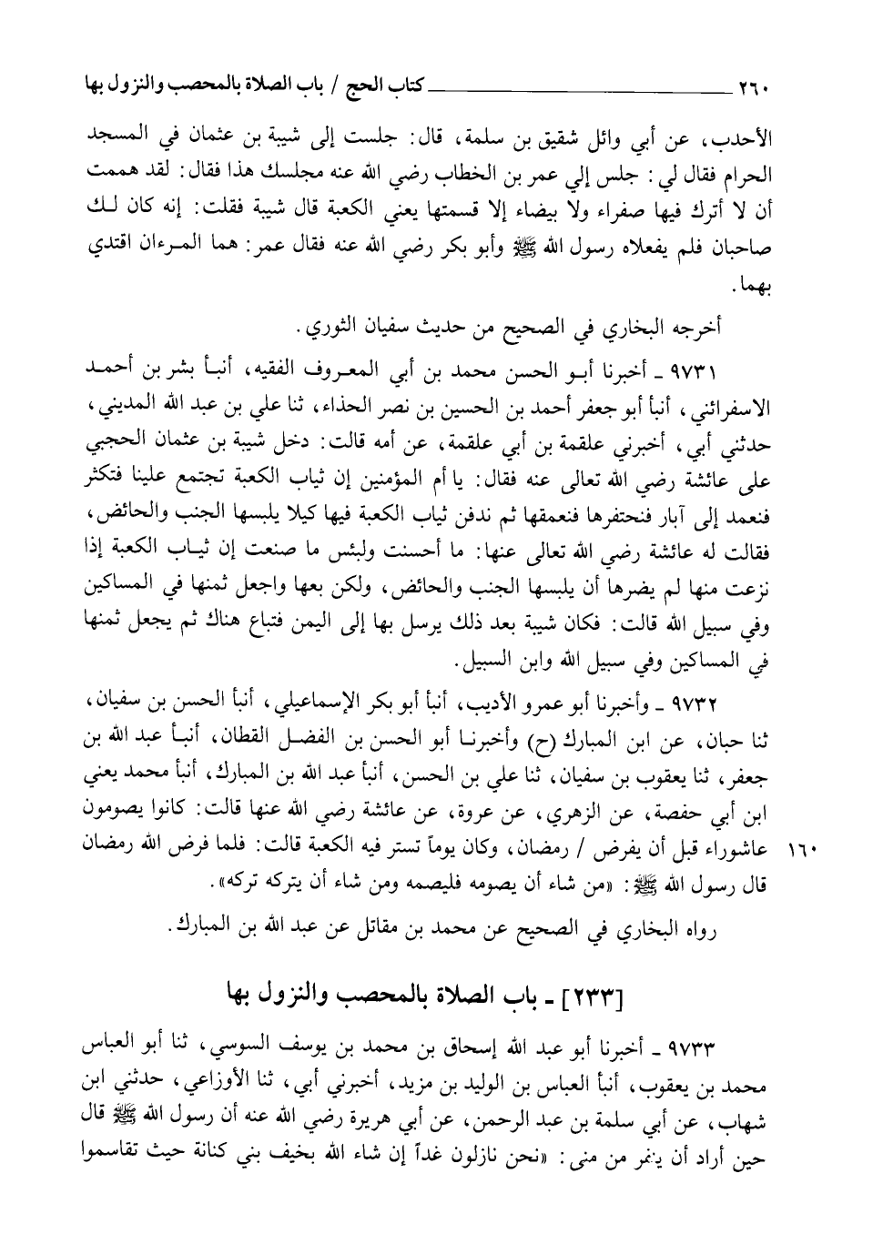9731 - أَخْبَرَنَا أَبُو الْحَسَنِ مُحَمَّدُ بْنُ أَبِي الْمَعْرُوفِ الْفَقِيهُ , أنبأ بِشْرُ بْنُ أَحْمَدَ الْإِسْفَرَايِينِيُّ , أنبأ أَبُو جَعْفَرٍ أَحْمَدُ بْنُ الْحُسَيْنِ بْنِ نَصْرٍ الْحَذَّاءُ , ثنا عَلِيُّ بْنُ عَبْدِ اللهِ الْمَدِينِيُّ , حَدَّثَنِي أَبِي , أَخْبَرَنِي عَلْقَمَةُ بْنُ أَبِي عَلْقَمَةَ , عَنْ أُمِّهِ , قَالَتْ: دَخَلَ شَيْبَةُ بْنُ عُثْمَانَ الْحَجَبِيُّ عَلَى عَائِشَةَ رَضِيَ اللهُ تَعَالَى عَنْهَا , فَقَالَ: يَا أُمَّ الْمُؤْمِنِينَ إِنَّ ثِيَابَ الْكَعْبَةِ تَجْتَمِعُ عَلَيْنَا فَتَكْثُرُ فَنَعْمَدُ إِلَى آبَارٍ فَنَحْتَفِرُهَا فَنُعَمِّقُهَا ثُمَّ نَدْفِنُ ثِيَابَ الْكَعْبَةِ فِيهَا كَيْلَا يَلْبَسَهَا الْجُنُبُ وَالْحَائِضُ فَقَالَتْ لَهُ عَائِشَةُ رَضِيَ اللهُ تَعَالَى عَنْهَا: §مَا أَحْسَنْتَ وَلَبِئْسَ مَا صَنَعْتَ إِنَّ ثِيَابَ الْكَعْبَةِ إِذَا نُزِعَتْ مِنْهَا لَمْ يَضُرَّهَا أَنْ يَلْبَسَهَا الْجُنُبُ وَالْحَائِضُ وَلَكِنْ بِعْهَا وَاجْعَلْ ثَمَنَهَا فِي الْمَسَاكِينِ وَفِي سَبِيلِ اللهِ قَالَتْ: فَكَانَ شَيْبَةُ بَعْدَ ذَلِكَ يُرْسِلُ بِهَا إِلَى الْيَمَنِ فَتُبَاعُ هُنَاكَ ثُمَّ يَجْعَلُ ثَمَنَهَا فِي الْمَسَاكِينِ وَفِي سَبِيلِ اللهِ وَابْنِ السَّبِيلِ