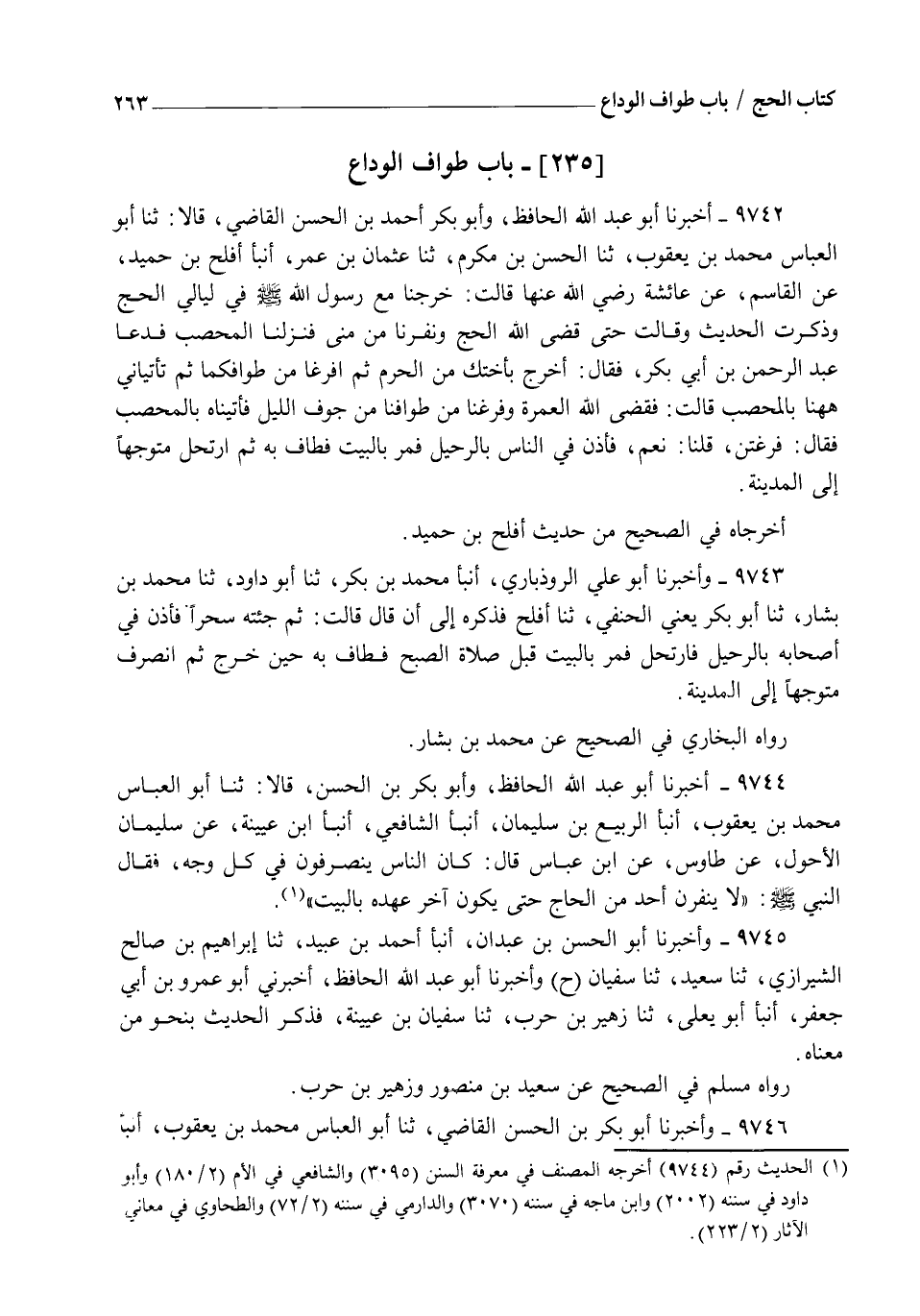 9744 - أَخْبَرَنَا أَبُو عَبْدِ اللهِ الْحَافِظُ , وَأَبُو بَكْرِ بْنُ الْحَسَنِ قَالَا: ثنا أَبُو الْعَبَّاسِ مُحَمَّدُ بْنُ يَعْقُوبَ , أنبأ الرَّبِيعُ بْنُ سُلَيْمَانَ , أنبأ الشَّافِعِيُّ , أنبأ ابْنُ عُيَيْنَةَ , عَنْ سُلَيْمَانَ الْأَحْوَلِ , عَنْ طَاوُسٍ , عَنِ ابْنِ عَبَّاسٍ , قَالَ: كَانَ النَّاسُ يَنْصَرِفُونَ فِي كُلِّ وَجْهٍ , فَقَالَ النَّبِيُّ صَلَّى اللهُ عَلَيْهِ وَسَلَّمَ: §" لَا يَنْفِرَنَّ أَحَدٌ مِنَ الْحَاجِّ حَتَّى يَكُونَ آخِرُ عَهْدِهِ بِالْبَيْتِ "