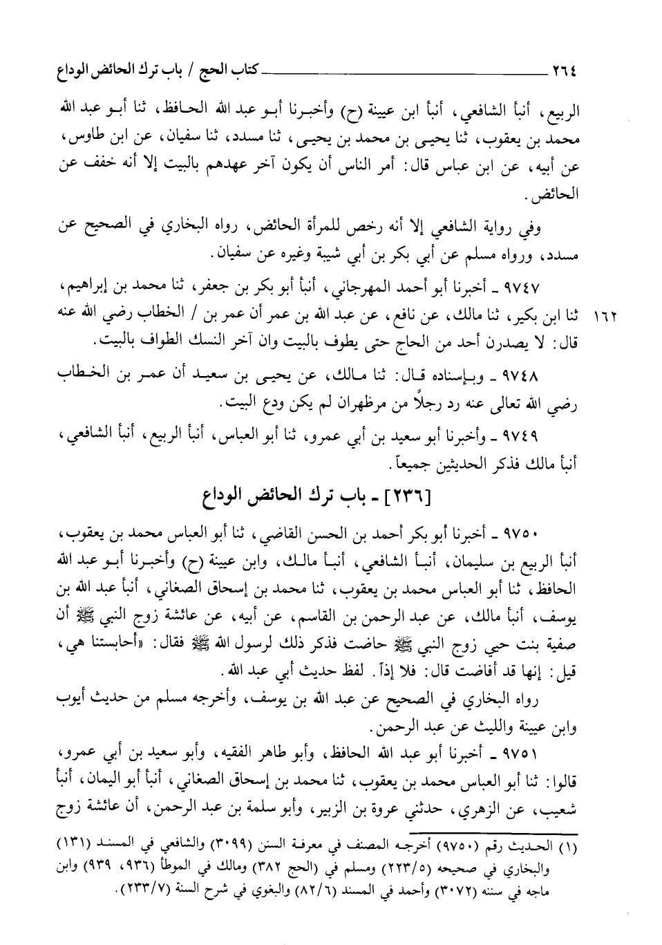 9750 - أَخْبَرَنَا أَبُو بَكْرٍ أَحْمَدُ بْنُ الْحَسَنِ الْقَاضِي , ثنا أَبُو الْعَبَّاسِ مُحَمَّدُ بْنُ يَعْقُوبَ , أنبأ الرَّبِيعُ بْنُ سُلَيْمَانَ , أنبأ الشَّافِعِيُّ , أنبأ مَالِكٌ , وَابْنُ عُيَيْنَةَ ح وَأَخْبَرَنَا أَبُو عَبْدِ اللهِ الْحَافِظُ , ثنا أَبُو الْعَبَّاسِ مُحَمَّدُ بْنُ يَعْقُوبَ , ثنا مُحَمَّدُ بْنُ إِسْحَاقَ الصَّغَانِيُّ , أنبأ عَبْدُ اللهِ بْنُ يُوسُفَ , أنبأ مَالِكٌ , عَنْ عَبْدِ الرَّحْمَنِ بْنِ الْقَاسِمِ , عَنْ أَبِيهِ , عَنْ عَائِشَةَ , زَوْجِ النَّبِيِّ صَلَّى اللهُ عَلَيْهِ وَسَلَّمَ أَنَّ صَفِيَّةَ بِنْتَ حُيَيٍّ زَوْجَ النَّبِيِّ صَلَّى اللهُ عَلَيْهِ وَسَلَّمَ حَاضَتْ فَذُكِرَ ذَلِكَ لِرَسُولِ اللهِ صَلَّى اللهُ عَلَيْهِ وَسَلَّمَ , فَقَالَ: " §أَحَابِسَتُنَا هِيَ؟ " قِيلَ: إِنَّهَا قَدْ أَفَاضَتْ , قَالَ: " فَلَا إِذًا " لَفْظُ حَدِيثِ أَبِي عَبْدِ اللهِ , رَوَاهُ الْبُخَارِيُّ فِي الصَّحِيحِ عَنْ عَبْدِ اللهِ بْنِ يُوسُفَ وَأَخْرَجَهُ مُسْلِمٌ مِنْ حَدِيثِ أَيُّوبَ وَابْنِ عُيَيْنَةَ وَاللَّيْثِ , عَنْ عَبْدِ الرَّحْمَنِ