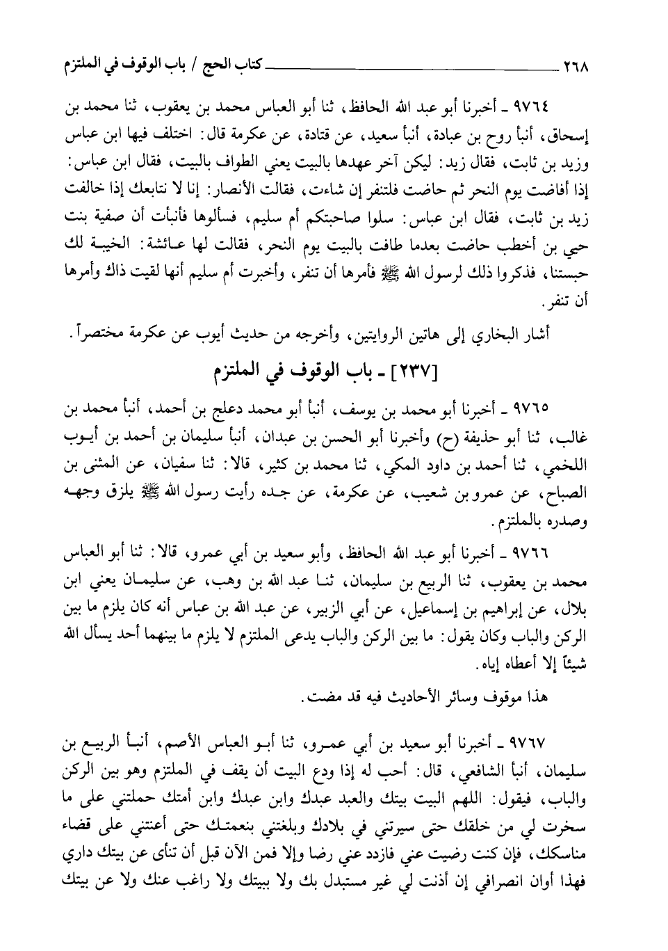 9766 - أَخْبَرَنَا أَبُو عَبْدِ اللهِ الْحَافِظُ , وَأَبُو سَعِيدِ بْنُ أَبِي عَمْرٍو قَالَا: ثنا أَبُو الْعَبَّاسِ مُحَمَّدُ بْنُ يَعْقُوبَ , ثنا الرَّبِيعُ بْنُ سُلَيْمَانَ , ثنا عَبْدُ اللهِ بْنُ وَهْبٍ , عَنْ سُلَيْمَانَ يَعْنِي ابْنَ بِلَالٍ , عَنْ إِبْرَاهِيمَ بْنِ إِسْمَاعِيلَ , عَنْ أَبِي الزُّبَيْرِ , عَنْ عَبْدِ اللهِ بْنِ عَبَّاسٍ أَنَّهُ كَانَ يَلْزَمُ مَا بَيْنَ الرُّكْنِ وَالْبَابِ وَكَانَ يَقُولُ: §" مَا بَيْنَ الرُّكْنِ وَالْبَابِ يُدْعَى الْمُلْتَزَمَ لَا يَلْزَمُ مَا بَيْنَهُمَا أَحَدٌ يَسْأَلُ اللهَ شَيْئًا إِلَّا أَعْطَاهُ إِيَّاهُ " هَذَا مَوْقُوفٌ , وَسَائِرُ الْأَحَادِيثِ فِيهِ قَدْ مَضَتْ