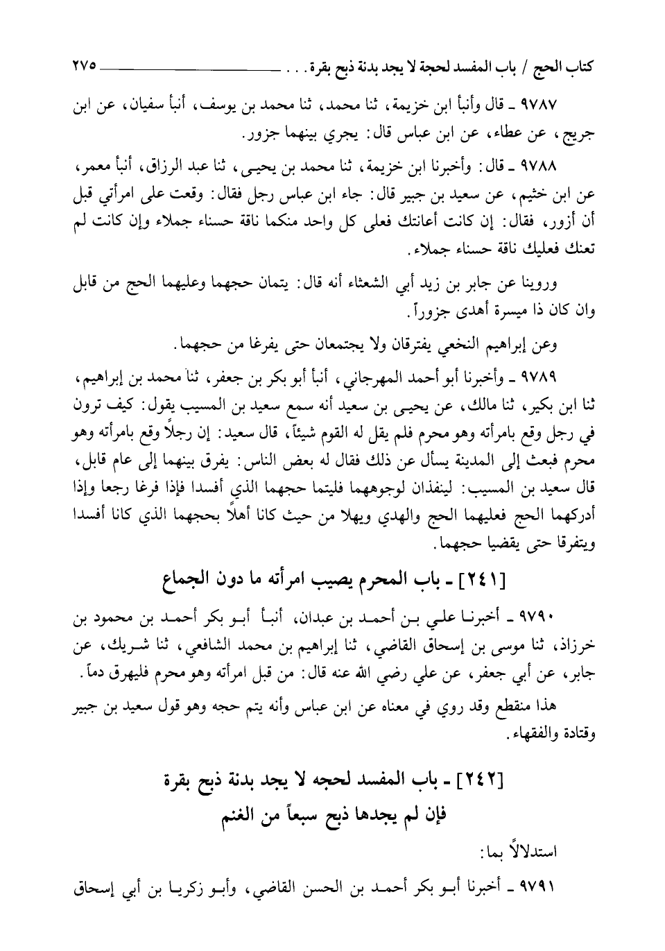9788 - قَالَ: وَأَخْبَرَنَا ابْنُ خُزَيْمَةَ , ثنا مُحَمَّدُ بْنُ يَحْيَى , ثنا عَبْدُ الرَّزَّاقِ , أنبأ مَعْمَرٌ , عَنِ ابْنِ خُثَيْمٍ , عَنْ سَعِيدِ بْنِ جُبَيْرٍ , قَالَ: جَاءَ ابْنَ عَبَّاسٍ رَجُلٌ , فَقَالَ: §وَقَعْتُ عَلَى امْرَأَتِي قَبْلَ أَنْ أَزُورَ , فَقَالَ: " إِنْ كَانَتْ أَعَانَتْكَ فَعَلَى كُلِّ وَاحِدٍ مِنْكُمَا نَاقَةٌ حَسْنَاءُ جَمْلَاءُ , وَإِنْ كَانَتْ لَمْ تُعِنْكَ فَعَلَيْكَ نَاقَةٌ حَسْنَاءُ جَمْلَاءُ " وَرُوِّينَا عَنْ جَابِرِ بْنِ زَيْدٍ أَبِي الشَّعْثَاءِ أَنَّهُ قَالَ: " يُتِمَّانِ حَجَّهُمَا وَعَلَيْهِمَا الْحَجُّ مِنْ قَابِلٍ وَإِنْ كَانَ ذَا مَيْسَرَةٍ أَهْدَى جَزُورًا " , وَعَنْ إِبْرَاهِيمَ النَّخَعِيِّ " يَفْتَرِقَانِ وَلَا يَجْتَمِعَانِ حَتَّى يَفْرُغَا مِنْ حَجِّهِمَا "