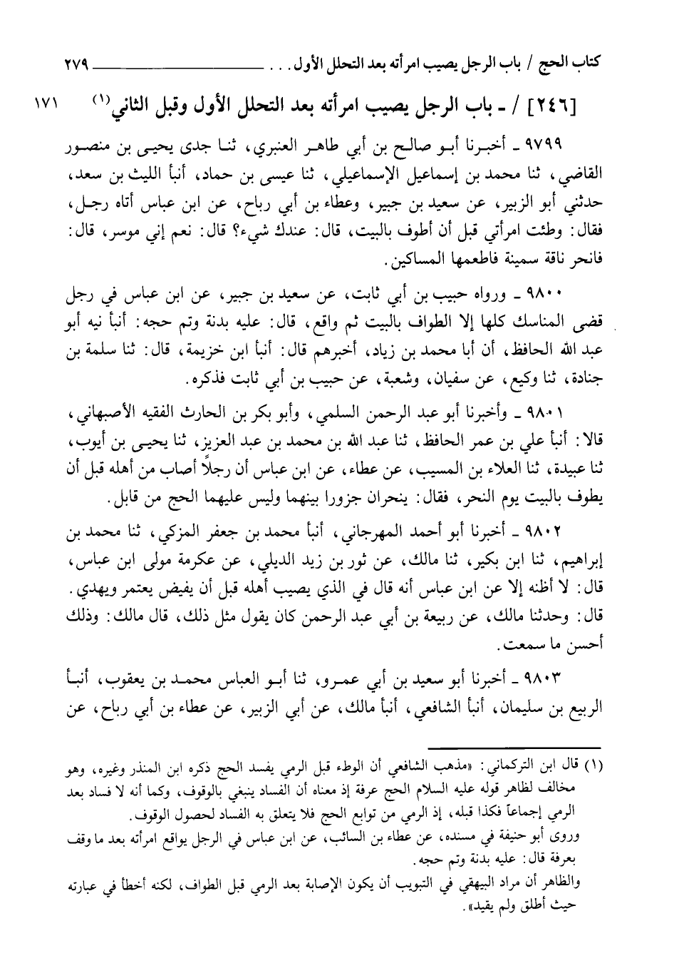 9800 - وَرَوَاهُ حَبِيبُ بْنُ أَبِي ثَابِتٍ , عَنْ سَعِيدِ بْنِ جُبَيْرٍ , عَنِ ابْنِ عَبَّاسٍ فِي رَجُلٍ §قَضَى الْمَنَاسِكَ كُلَّهَا إِلَّا الطَّوَافَ بِالْبَيْتِ ثُمَّ وَاقَعَ , قَالَ: عَلَيْهِ بَدَنَةٌ وَتَمَّ حَجُّهُ " أَنْبَأَنِيهِ أَبُو عَبْدِ اللهِ الْحَافِظُ أَنَّ أَبَا مُحَمَّدِ بْنَ زِيَادٍ أَخْبَرَهُمْ , قَالَ: أنبأ ابْنُ خُزَيْمَةَ , قَالَ: ثنا سَلَمَةُ بْنُ جُنَادَةَ , ثنا وَكِيعٌ , عَنْ سُفْيَانَ , وَشُعْبَةَ , عَنْ حَبِيبِ بْنِ أَبِي ثَابِتٍ فَذَكَرَهُ
