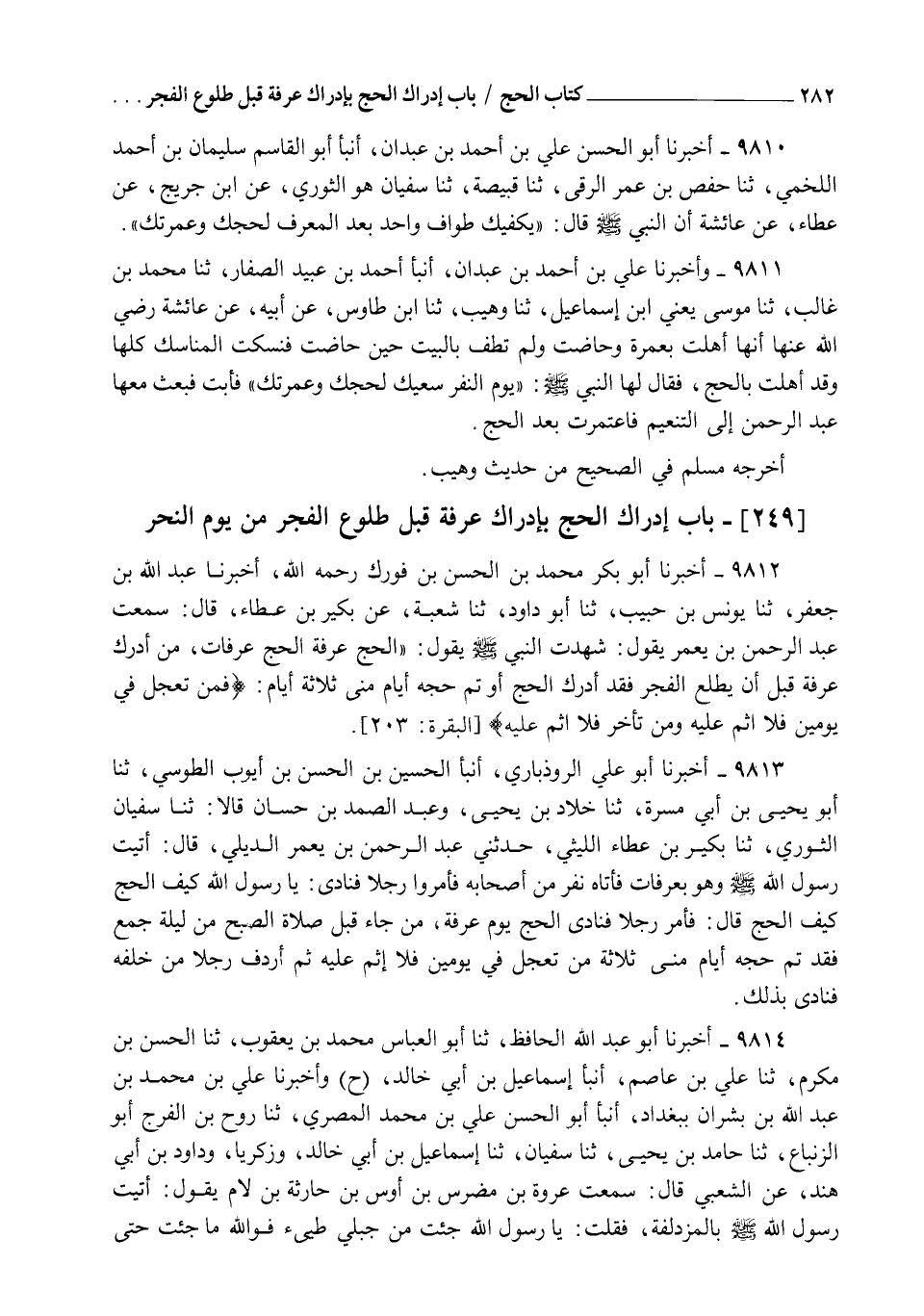 9814 - أَخْبَرَنَا أَبُو عَبْدِ اللهِ الْحَافِظُ , ثنا أَبُو الْعَبَّاسِ مُحَمَّدُ بْنُ يَعْقُوبَ , ثنا الْحَسَنُ بْنُ مُكْرَمٍ , ثنا عَلِيُّ بْنُ عَاصِمٍ , أنبأ إِسْمَاعِيلُ بْنُ أَبِي خَالِدٍ , ح وَأَخْبَرَنَا عَلِيُّ بْنُ مُحَمَّدِ بْنِ عَبْدِ اللهِ بْنِ بِشْرَانَ , بِبَغْدَادَ , أنبأ أَبُو الْحَسَنِ عَلِيُّ بْنُ مُحَمَّدٍ الْمِصْرِيُّ , ثنا رَوْحُ بْنُ الْفَرَجِ أَبُو الزِّنْبَاعِ , ثنا حَامِدُ بْنُ يَحْيَى , ثنا سُفْيَانُ , ثنا إِسْمَاعِيلُ بْنُ أَبِي خَالِدٍ , وَزَكَرِيَّا , وَدَاوُدُ بْنُ أَبِي هِنْدَ , عَنِ الشَّعْبِيِّ , قَالَ: سَمِعْتُ عُرْوَةَ بْنَ مُضَرِّسِ بْنِ أَوْسِ بْنِ حَارِثَةَ بْنِ لَامَ , يَقُولُ: أَتَيْتُ رَسُولَ اللهِ صَلَّى اللهُ عَلَيْهِ وَسَلَّمَ بِالْمُزْدَلِفَةِ فَقُلْتُ: يَا رَسُولَ اللهِ , جِئْتُ مِنْ جَبَلَيْ طَيِّئٍ فَوَاللهِ مَا جِئْتُ حَتَّى -[283]- أَتْعَبْتُ نَفْسِي وَأَنْضَيْتُ رَاحِلَتِي وَمَا تَرَكْتُ مِنْ هَذِهِ الْجِبَالِ شَيْئًا إِلَّا وَقَفْتُ عَلَيْهِ فَهَلْ لِي مِنْ حَجٍّ؟ فَقَالَ رَسُولُ اللهِ صَلَّى اللهُ عَلَيْهِ وَسَلَّمَ: §" مَنْ شَهِدَ مَعَنَا هَذِهِ الصَّلَاةَ صَلَاةَ الْفَجْرِ بِالْمُزْدَلِفَةِ وَكَانَ قَدْ وَقَفَ بِعَرَفَةَ قَبْلَ ذَلِكَ مِنْ لَيْلٍ أَوْ نَهَارٍ , فَقَدْ تَمَّ حَجُّهُ وَقَضَى تَفَثَهُ " قَالَ سُفْيَانُ: وَزَادَ زَكَرِيَّا فِيهِ وَكَانَ أَحْفَظَ الثَّلَاثَةِ لِهَذَا الْحَدِيثِ , قَالَ: فَقُلْتُ: يَا رَسُولَ اللهِ أَتَيْتُ هَذِهِ السَّاعَةَ مِنْ جَبَلَيْ طَيِّئٍ قَدْ أَكْلَلْتُ رَاحِلَتِي وَأَتْعَبْتُ نَفْسِي فَهَلْ لِي مِنْ حَجٍّ؟ , فَقَالَ: " مَنْ شَهِدَ مَعَنَا هَذِهِ الصَّلَاةَ وَوَقَفَ مَعَنَا حَتَّى يُفِيضَ , وَكَانَ قَدْ وَقَفَ قَبْلَ ذَلِكَ بِعَرَفَةَ مِنْ لَيْلٍ أَوْ نَهَارٍ فَقَدْ تَمَّ حَجُّهُ وَقَضَى تَفَثَهُ " , قَالَ سُفْيَانُ: وَزَادَ دَاوُدُ بْنُ أَبِي هِنْدَ , قَالَ: أَتَيْتُ رَسُولَ اللهِ صَلَّى اللهُ عَلَيْهِ وَسَلَّمَ حِينَ بَرَقَ الْفَجْرُ وَذَكَرَ الْحَدِيثَ , لَفْظُ حَدِيثِ ابْنِ بِشْرَانَ