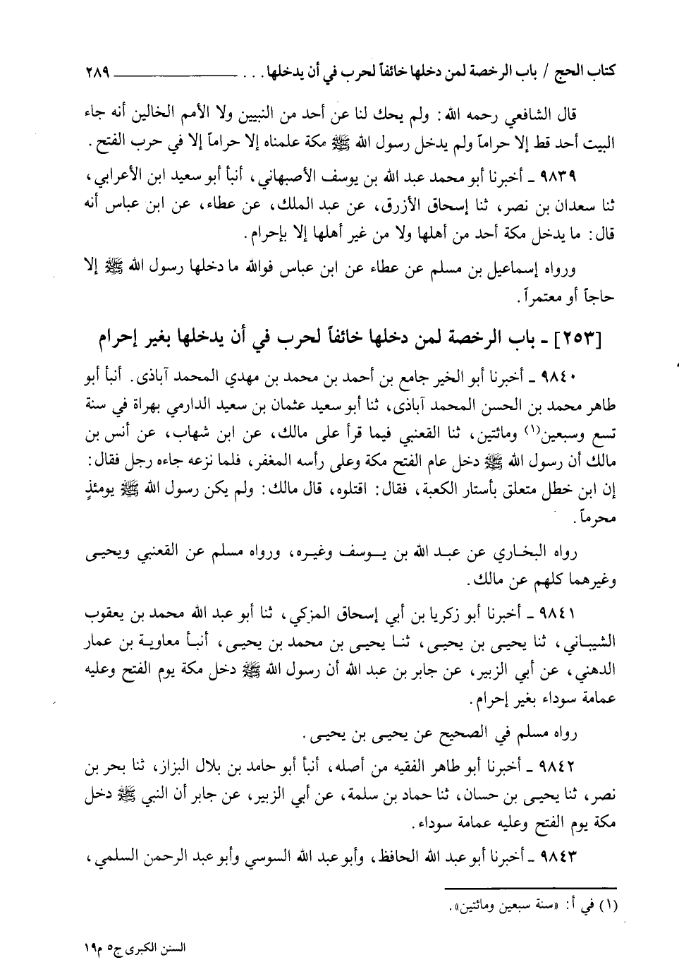 9840 - أَخْبَرَنَا أَبُو الْخَيْرِ جَامِعُ بْنُ أَحْمَدَ بْنِ مُحَمَّدِ بْنِ مَهْدِيٍّ الْمُحَمَّدْآبَاذِيُّ , أنبأ أَبُو طَاهِرٍ مُحَمَّدُ بْنُ الْحَسَنِ الْمُحَمَّدْآبَاذِيُّ , ثنا أَبُو سَعِيدٍ عُثْمَانُ بْنُ سَعِيدٍ الدَّارِمِيُّ بِهَرَاةَ فِي سَنَةِ تِسْعٍ وَسَبْعِينَ وَمِائَتَيْنِ , ثنا الْقَعْنَبِيُّ فِيمَا قَرَأَ عَلَى مَالِكٍ , عَنِ ابْنِ شِهَابٍ , عَنْ أَنَسِ بْنِ مَالِكٍ أَنَّ رَسُولَ اللهِ صَلَّى اللهُ عَلَيْهِ وَسَلَّمَ دَخَلَ عَامَ الْفَتْحِ مَكَّةَ وَعَلَى رَأْسِهِ الْمِغْفَرُ فَلَمَّا نَزَعَهُ جَاءَهُ رَجُلٌ , فَقَالَ: إِنَّ ابْنَ خَطَلٍ مُتَعَلِّقٌ بِأَسْتَارِ الْكَعْبَةِ , فَقَالَ: " §اقْتُلُوهُ " قَالَ مَالِكٌ: وَلَمْ يَكُنْ رَسُولُ اللهِ صَلَّى اللهُ عَلَيْهِ وَسَلَّمَ يَوْمَئِذٍ مُحْرِمًا , رَوَاهُ الْبُخَارِيُّ عَنْ عَبْدِ اللهِ بْنِ يُوسُفَ وَغَيْرِهِ , وَرَوَاهُ مُسْلِمٌ عَنِ الْقَعْنَبِيِّ وَيَحْيَى وَغَيْرِهِمَا كُلُّهُمْ عَنْ مَالِكٍ