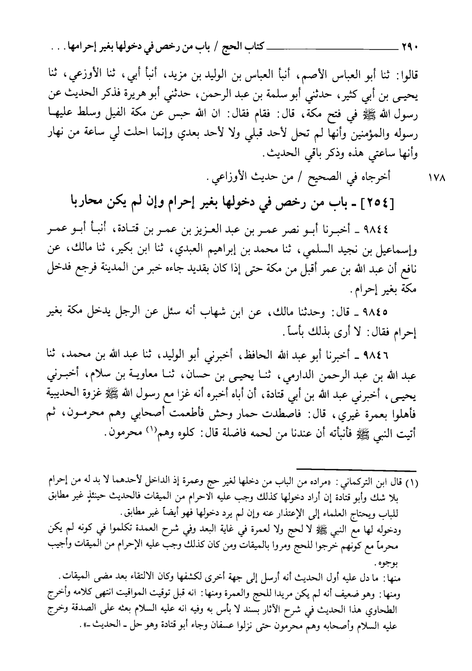 9845 - قَالَ: وَحَدَّثَنَا مَالِكٌ , عَنِ ابْنِ شِهَابٍ أَنَّهُ سُئِلَ §عَنِ الرَّجُلِ يَدْخُلُ مَكَّةَ بِغَيْرِ إِحْرَامٍ , فَقَالَ: " لَا أَرَى بِذَلِكَ بَأْسًا "