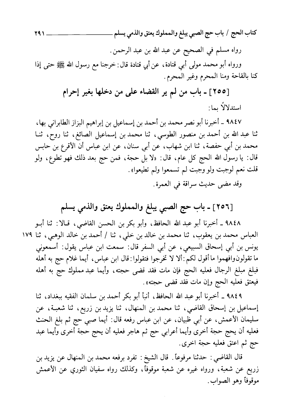 9849 - أَخْبَرَنَا أَبُو عَبْدِ اللهِ الْحَافِظُ , أنبأ أَبُو بَكْرٍ أَحْمَدُ بْنُ سَلْمَانَ الْفَقِيهُ بِبَغْدَادَ , ثنا إِسْمَاعِيلُ بْنُ إِسْحَاقَ الْقَاضِي , ثنا مُحَمَّدُ بْنُ الْمِنْهَالِ , ثنا يَزِيدُ بْنُ زُرَيْعٍ , ثنا شُعْبَةُ , عَنْ سُلَيْمَانَ الْأَعْمَشِ , عَنْ أَبِي ظَبْيَانَ , عَنِ ابْنِ عَبَّاسٍ رَفَعَهُ , قَالَ: §" أَيُّمَا صَبِيٍّ حَجَّ ثُمَّ بَلَغَ الْحِنْثَ فَعَلَيْهِ أَنْ يَحُجَّ حَجَّةً أُخْرَى , وَأَيُّمَا أَعْرَابِيٍّ حَجَّ ثُمَّ هَاجَرَ فَعَلَيْهِ أَنْ يَحُجَّ حَجَّةً أُخْرَى , وَأَيُّمَا عَبْدٍ حَجَّ ثُمَّ أُعْتِقَ فَعَلَيْهِ حَجَّةٌ أُخْرَى " قَالَ الْقَاضِي: حَدَّثَنَا مَرْفُوعًا , قَالَ الشَّيْخُ: تَفَرَّدَ بِرَفْعِهِ مُحَمَّدُ بْنُ الْمِنْهَالِ , عَنْ يَزِيدَ بْنِ زُرَيْعٍ , عَنْ شُعْبَةَ , وَرَوَاهُ غَيْرُهُ , عَنْ شُعْبَةَ مَوْقُوفًا , وَكَذَلِكَ رَوَاهُ سُفْيَانُ الثَّوْرِيُّ , عَنِ الْأَعْمَشِ مَوْقُوفًا وَهُوَ الصَّوَابُ