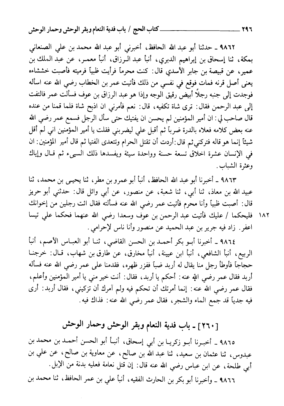 9862 - حَدَّثَنَا أَبُو عَبْدِ اللهِ الْحَافِظُ , أَخْبَرَنِي أَبُو عَبْدِ اللهِ مُحَمَّدُ بْنُ عَلِيٍّ الصَّنْعَانِيُّ بِمَكَّةَ , ثنا إِسْحَاقُ بْنُ إِبْرَاهِيمَ الدَّبَرِيُّ , أنبأ عَبْدُ الرَّزَّاقِ , أنبأ مَعْمَرٌ , عَنْ عَبْدِ الْمَلِكِ بْنِ عُمَيْرٍ , عَنْ قَبِيصَةَ بْنِ جَابِرٍ الْأَسَدِيِّ , قَالَ: كُنْتُ مُحْرِمًا فَرَأَيْتُ ظَبْيًا فَرَمَيْتُهُ فَأَصَبْتُ خُشَشَاءَهُ يَعْنِي أَصْلَ قَرْنِهِ فَمَاتَ فَوَقَعَ فِي نَفْسِي مِنْ ذَلِكَ فَأَتَيْتُ عُمَرَ بْنَ الْخَطَّابِ رَضِيَ اللهُ عَنْهُ أَسْأَلُهُ فَوَجَدْتُ إِلَى جَنْبِهِ رَجُلًا أَبْيَضَ رَقِيقَ الْوَجْهِ , وَإِذَا هُوَ عَبْدُ الرَّحْمَنِ بْنُ عَوْفٍ فَسَأَلْتُ عُمَرَ فَالْتَفَتَ إِلَى عَبْدِ الرَّحْمَنِ , فَقَالَ: " تَرَى شَاةً تَكْفِيهِ؟ " قَالَ: نَعَمْ , §فَأَمَرَنِي أَنْ أَذْبَحَ شَاةً فَلَمَّا قُمْنَا مِنْ عِنْدِهِ , قَالَ صَاحِبِي لِي: إنَّ أَمِيرَ الْمُؤْمِنِينَ لَمْ يُحْسِنْ أَنْ يُفْتِيَكَ حَتَّى سَأَلَ الرَّجُلَ فَسَمِعَ عُمَرُ رَضِيَ اللهُ عَنْهُ بَعْضَ كَلَامِهِ فَعَلَاهُ بِالدِّرَّةِ ضَرْبًا , ثُمَّ أَقْبَلَ عَلَيَّ لِيَضْرِبَنِي فَقُلْتُ: يَا أَمِيرَ الْمُؤْمِنِينَ إِنِّي لَمْ أَقُلْ شَيْئًا إِنَّمَا هُوَ قَالَهُ فَتَرَكَنِي , ثُمَّ قَالَ: " أَرَدْتَ أَنْ تَقْتُلَ الْحَرَامَ وَتَتَعَدَّى الْفُتْيَا " ثُمَّ قَالَ أَمِيرُ الْمُؤْمِنِينَ: " إنَّ فِي الْإِنْسَانِ عَشَرَةَ أَخْلَاقٍ , تِسْعَةٌ حَسَنَةٌ وَوَاحِدَةٌ سَيِّئَةٌ وَيُفْسِدُهَا ذَلِكَ السَّيِّئُ " ثُمَّ قَالَ: " وَإِيَّاكَ وَعَثْرَةَ الشَّبَابِ "