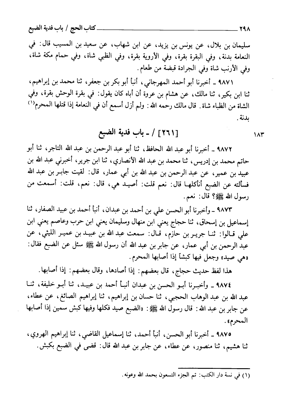 9873 - وَأَخْبَرَنَا أَبُو الْحَسَنِ عَلِيُّ بْنُ أَحْمَدَ بْنِ عَبْدَانَ , أنبأ أَحْمَدُ بْنُ عُبَيْدٍ الصَّفَّارُ , ثنا إِسْمَاعِيلُ بْنُ إِسْحَاقَ , ثنا حَجَّاجٌ يَعْنِي ابْنَ مِنْهَالٍ , وَسُلَيْمَانُ يَعْنِي ابْنَ حَرْبٍ , وَعَاصِمٌ يَعْنِي ابْنَ عَلِيٍّ , قَالُوا: ثنا جَرِيرُ بْنُ حَازِمٍ , قَالَ: سَمِعْتُ عَبْدَ اللهِ بْنَ عُبَيْدِ بْنِ عُمَيْرٍ اللَّيْثِيَّ , عَنْ عَبْدِ الرَّحْمَنِ بْنِ أَبِي عَمَّارٍ , عَنْ جَابِرِ بْنِ عَبْدِ اللهِ أَنَّ رَسُولَ اللهِ صَلَّى اللهُ عَلَيْهِ وَسَلَّمَ سُئِلَ عَنِ الضَّبُعِ , فَقَالَ: §" هِيَ صَيْدٌ " وَجَعَلَ فِيهَا كَبْشًا إِذَا أَصَابَهَا الْمُحْرِمُ هَذَا لَفْظُ حَدِيثِ حَجَّاجٍ , قَالَ بَعْضُهُمْ: إِذَا أَصَادَهَا , وَقَالَ بَعْضُهُمْ: إِذَا أَصَابَهَا