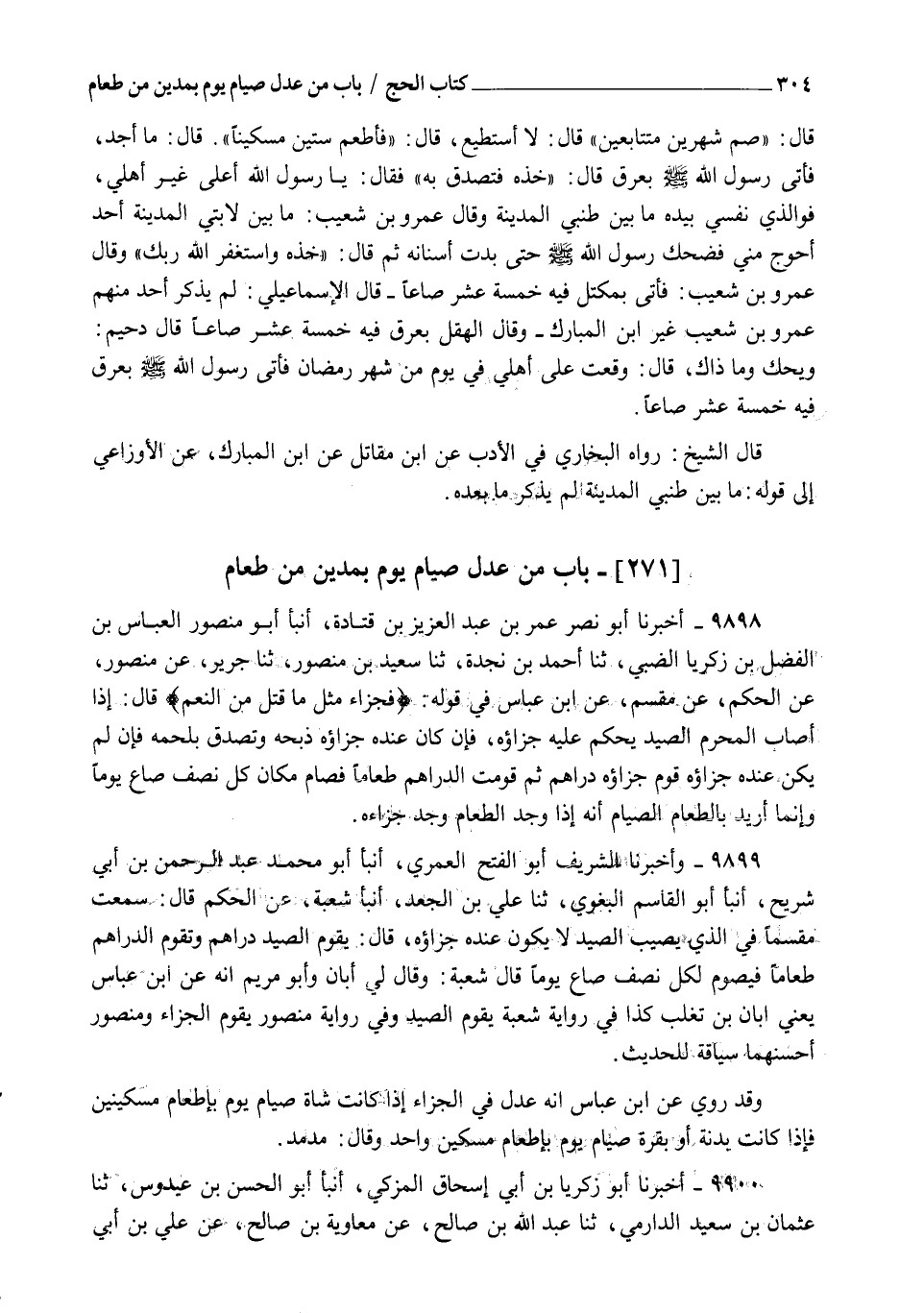 9898 - أَخْبَرَنَا أَبُو نَصْرٍ عُمَرُ بْنُ عَبْدِ الْعَزِيزِ بْنِ قَتَادَةَ , أنبأ أَبُو مَنْصُورٍ الْعَبَّاسُ بْنُ الْفَضْلِ بْنِ زَكَرِيَّا الضَّبِّيُّ , ثنا أَحْمَدُ بْنُ نَجْدَةَ , ثنا سَعِيدُ بْنُ مَنْصُورٍ , ثنا جَرِيرٌ , عَنْ مَنْصُورٍ , عَنِ الْحَكَمِ , عَنْ مِقْسَمٍ , عَنِ ابْنِ عَبَّاسٍ , فِي قَوْلِهِ: {§فَجَزَاءٌ مِثْلُ مَا قَتَلَ مِنَ النَّعَمِ} [المائدة: 95] قَالَ: " إِذَا أَصَابَ الْمُحْرِمُ الصَّيْدَ يُحْكَمُ عَلَيْهِ جَزَاؤُهُ , فَإِنْ كَانَ عِنْدَهُ جَزَاؤُهُ ذَبَحَهُ وَتَصَدَّقَ بِلَحْمِهِ , فَإِنْ لَمْ يَكُنْ عِنْدَهُ جَزَاؤُهُ قُوِّمَ جَزَاؤُهُ دَرَاهِمَ , ثُمَّ قُوِّمَتِ الدَّرَاهِمُ طَعَامًا , فَصَامَ مَكَانَ كُلِّ نِصْفِ صَاعٍ يَوْمًا , وَإِنَّمَا أُرِيدَ بِالطَّعَامِ الصِّيَامُ أَنَّهُ إِذَا وَجَدَ الطَّعَامَ وَجَدَ جَزَاءَهُ "