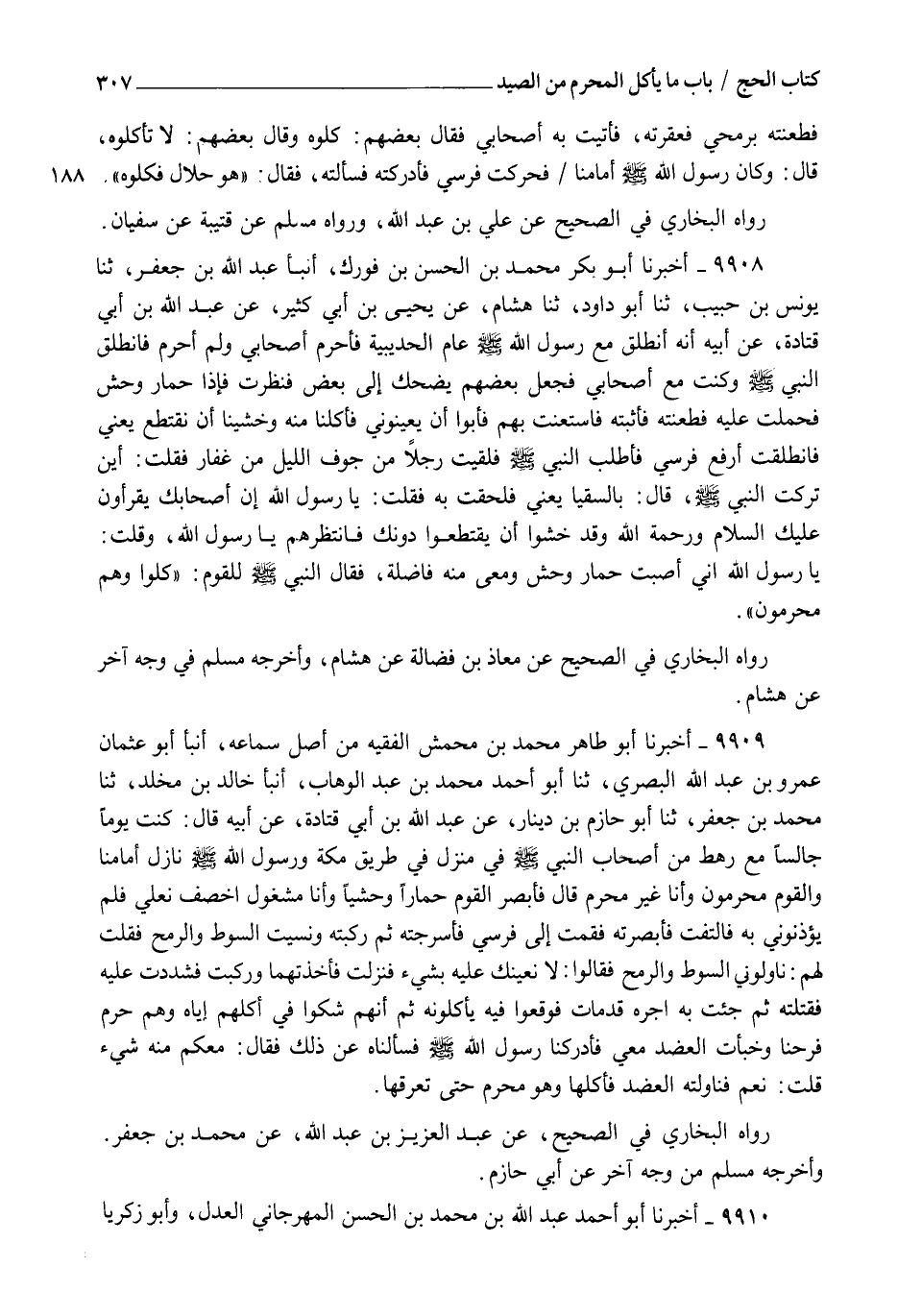 9909 - أَخْبَرَنَا أَبُو طَاهِرٍ مُحَمَّدُ بْنُ مُحَمَّدِ بْنِ مَحْمَشٍ الْفَقِيهُ مِنْ أَصْلِ سَمَاعِهِ , أنبأ أَبُو عُثْمَانَ عَمْرُو بْنُ عَبْدِ اللهِ الْبَصْرِيُّ , ثنا أَبُو أَحْمَدَ مُحَمَّدُ بْنُ عَبْدِ الْوَهَّابِ , أنبأ خَالِدُ بْنُ مَخْلَدٍ , ثنا مُحَمَّدُ بْنُ جَعْفَرٍ , ثنا أَبُو حَازِمِ بْنُ دِينَارٍ , عَنْ عَبْدِ اللهِ بْنِ أَبِي قَتَادَةَ , عَنْ أَبِيهِ , قَالَ: كُنْتُ يَوْمًا جَالِسًا مَعَ رَهْطٍ مِنْ أَصْحَابِ النَّبِيِّ صَلَّى اللهُ عَلَيْهِ وَسَلَّمَ فِي مَنْزِلٍ فِي طَرِيقِ مَكَّةَ وَرَسُولُ اللهِ صَلَّى اللهُ عَلَيْهِ وَسَلَّمَ نَازِلٌ أَمَامَنَا وَالْقَوْمُ مُحْرِمُونَ وَأَنَا غَيْرُ مُحْرِمٍ , قَالَ: فَأَبْصَرَ الْقَوْمُ حِمَارًا وَحْشِيًّا وَأَنَا مَشْغُولٌ أَخْصِفُ نَعْلِي فَلَمْ يُؤْذِنُونِي بِهِ فَالْتَفَتُّ فَأَبْصَرْتُهُ , فَقُمْتُ إِلَى فَرَسِي فَأَسْرَجْتُهُ , ثُمَّ رَكِبْتُهُ وَنَسِيتُ السَّوْطَ وَالرُّمْحَ , فَقُلْتُ لَهُمْ: نَاوِلُونِي السَّوْطَ وَالرُّمْحَ , فَقَالُوا: لَا نُعِينُكَ عَلَيْهِ بِشَيْءٍ , فَنَزَلْتُ فَأَخَذْتُهُمَا وَرَكِبْتُ فَشَدَدْتُ عَلَيْهِ فَقَتَلْتُهُ , ثُمَّ جِئْتُ بِهِ أَجُرُّهُ قَدْ مَاتَ فَوَقَعُوا فِيهِ يَأْكُلُونَهُ , ثُمَّ إِنَّهُمْ شَكُّوا فِي أَكْلِهِمْ إِيَّاهُ وَهُمْ حُرُمٌ , فَرُحْنَا وَخَبَّأْتُ الْعَضُدَ مَعِي فَأَدْرَكَنَا رَسُولَ اللهِ صَلَّى اللهُ عَلَيْهِ وَسَلَّمَ فَسَأَلْنَاهُ عَنْ ذَلِكَ , فَقَالَ: " مَعَكُمْ مِنْهُ شَيْءٌ؟ " قُلْتُ: نَعَمْ فَنَاوَلْتُهُ الْعَضُدَ §فَأَكَلَهَا وَهُوَ مُحْرِمٌ حَتَّى تَعَرَّقَهَا رَوَاهُ الْبُخَارِيُّ فِي الصَّحِيحِ عَنْ عَبْدِ الْعَزِيزِ بْنِ عَبْدِ اللهِ , عَنْ مُحَمَّدِ بْنِ جَعْفَرٍ , وَأَخْرَجَهُ مُسْلِمٌ مِنْ وَجْهٍ آخَرَ عَنْ أَبِي حَازِمٍ