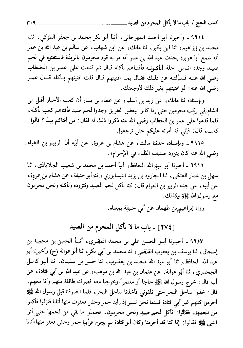 9916 - أَخْبَرَنَا أَبُو عَبْدِ اللهِ الْحَافِظُ , أنبأ أَحْمَدُ بْنُ مُحَمَّدِ بْنِ شُعَيْبٍ الْجَلَابَاذِيُّ , ثنا سَهْلُ بْنُ عَمَّارٍ الْعَتَكِيُّ , ثنا الْجَارُودُ بْنُ يَزِيدَ النَّيْسَابُورِيُّ , ثنا أَبُو حَنِيفَةَ , عَنْ هِشَامِ بْنِ عُرْوَةَ , عَنْ أَبِيهِ , عَنْ جَدِّهِ الزُّبَيْرِ بْنِ الْعَوَّامِّ , قَالَ: §" كُنَّا نَأْكُلُ لَحْمَ الصَّيْدِ وَنَتَزَوَّدُهُ وَنَأْكُلُهُ وَنَحْنُ مُحْرِمُونَ مَعَ رَسُولِ اللهِ صَلَّى اللهُ عَلَيْهِ وَسَلَّمَ " وَكَذَلِكَ رَوَاهُ إِبْرَاهِيمُ بْنُ طَهْمَانَ , عَنْ أَبِي حَنِيفَةَ بِمَعْنَاهُ