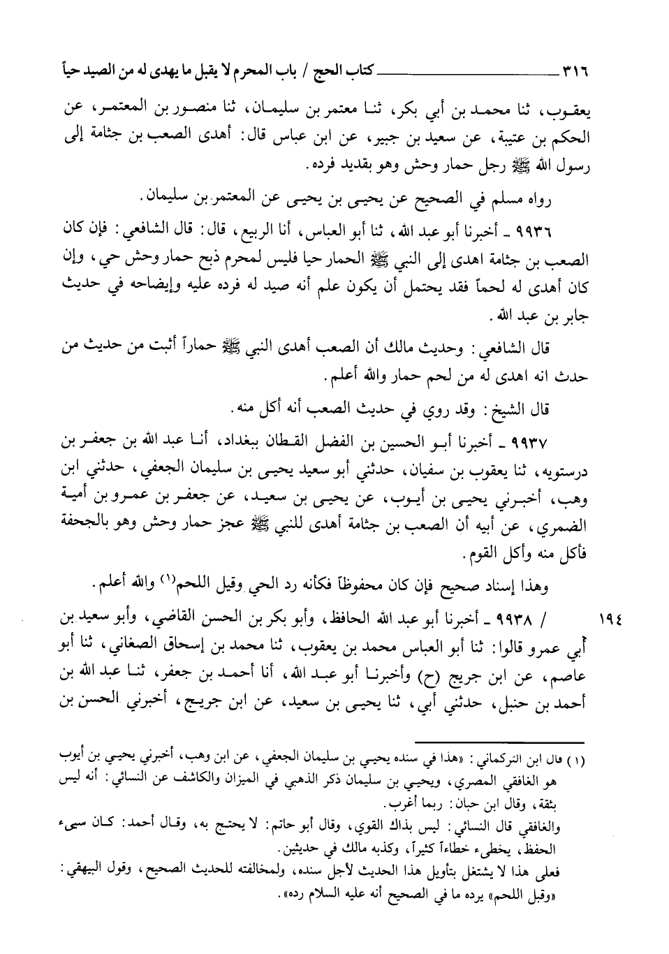 9937 - أَخْبَرَنَا أَبُو الْحُسَيْنِ بْنُ الْفَضْلِ الْقَطَّانُ , بِبَغْدَادَ أَنَا عَبْدُ اللهِ بْنُ جَعْفَرِ بْنِ دَرَسْتَوَيْهِ , ثنا يَعْقُوبُ بْنُ سُفْيَانَ , حَدَّثَنِي أَبُو سَعِيدٍ يَحْيَى بْنُ سُلَيْمَانَ الْجُعْفِيُّ , حَدَّثَنِي ابْنُ وَهْبٍ , أَخْبَرَنِي يَحْيَى بْنُ أَيُّوبَ , عَنْ يَحْيَى بْنِ سَعِيدٍ , عَنْ جَعْفَرِ بْنِ عَمْرِو بْنِ أُمَيَّةَ الضَّمْرِيِّ , عَنْ أَبِيهِ , " أَنَّ الصَّعْبَ بْنَ جَثَّامَةَ , §أَهْدَى لِلنَّبِيِّ صَلَّى اللهُ عَلَيْهِ وَسَلَّمَ عَجُزَ حِمَارِ وَحْشٍ , وَهُوَ بِالْجُحْفَةِ فَأَكَلَ مِنْهُ , وَأَكَلَ الْقَوْمُ " وَهَذَا إِسْنَادٌ صَحِيحٌ فَإِنْ كَانَ مَحْفُوظًا فَكَأَنَّهُ رَدَّ الْحِيَّ , وَقِيلَ: اللَّحْمَ , وَاللهُ أَعْلَمُ