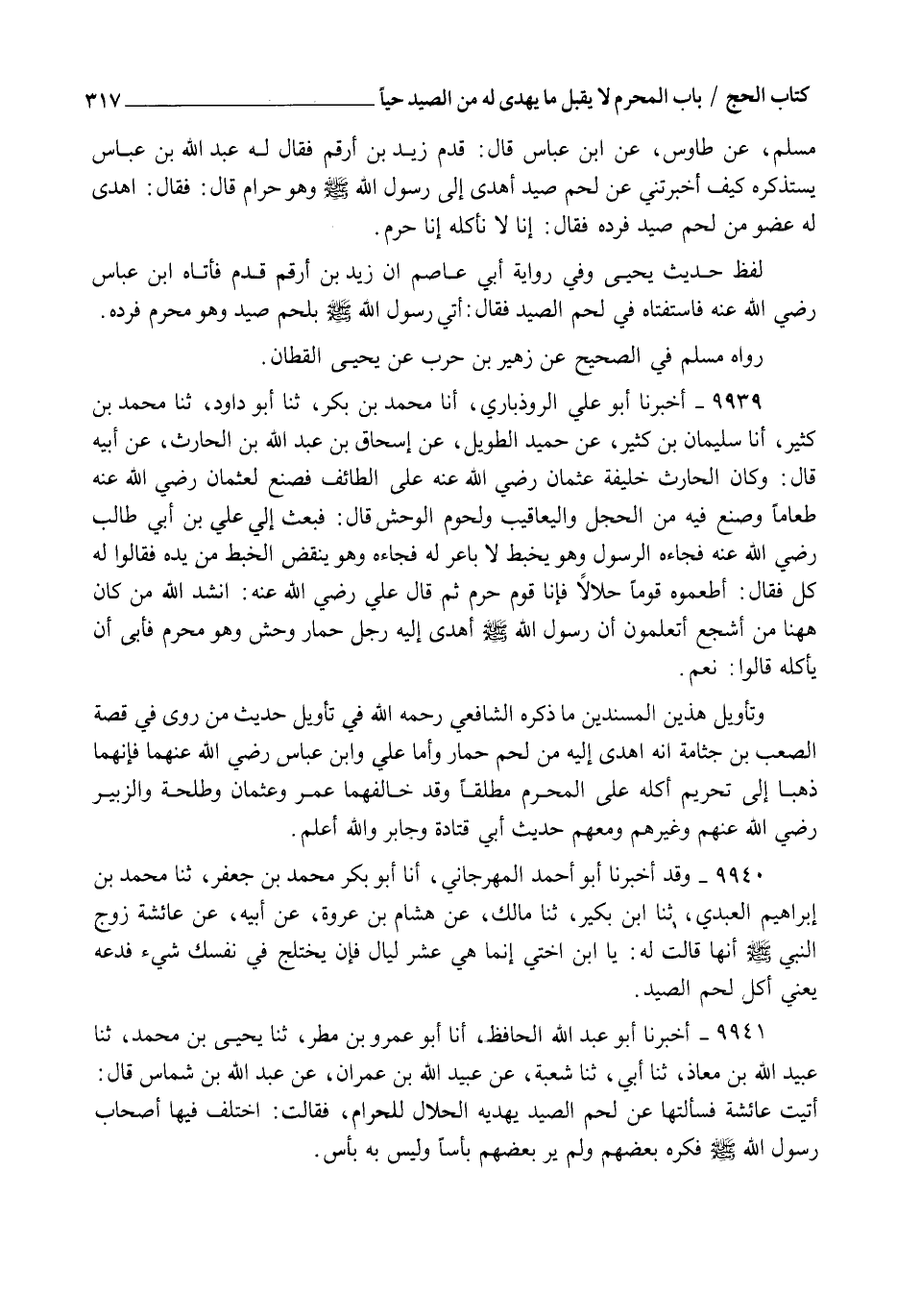 9939 - أَخْبَرَنَا أَبُو عَلِيٍّ الرُّوذْبَارِيُّ , أنا مُحَمَّدُ بْنُ بَكْرٍ , ثنا أَبُو دَاوُدَ , ثنا مُحَمَّدُ بْنُ كَثِيرٍ , أنا سُلَيْمَانُ بْنُ كَثِيرٍ , عَنْ حُمَيْدٍ الطَّوِيلِ , عَنْ إِسْحَاقَ بْنِ عَبْدِ اللهِ بْنِ الْحَارِثِ , عَنْ أَبِيهِ , قَالَ: وَكَانَ الْحَارِثُ خَلِيفَةَ عُثْمَانَ رَضِيَ اللهُ عَنْهُ عَلَى الطَّائِفِ فَصَنَعَ لِعُثْمَانَ رَضِيَ اللهُ عَنْهُ طَعَامًا , وَصَنَعَ فِيهِ مِنَ الْحَجَلِ وَالْيَعَاقِيبِ وَلُحُومِ الْوَحْشِ , قَالَ: فَبَعَثَ إِلَى عَلِيِّ بْنِ أَبِي طَالِبٍ رَضِيَ اللهُ عَنْهُ فَجَاءَهُ الرَّسُولُ وَهُوَ يَخْبِطُ لِأَبَاعِرَ لَهُ فَجَاءَهُ وَهُوَ يَنْقُضُ الْخَبْطَ مِنْ يَدِهِ فَقَالُوا لَهُ: كُلْ , فَقَالَ: " أَطْعِمُوهُ قَوْمًا حَلَالًا فَإِنَّا قَوْمٌ حُرُمٌ " ثُمَّ قَالَ عَلِيٌّ رَضِيَ اللهُ عَنْهُ: أَنْشُدُ اللهَ مَنْ كَانَ هَا هُنَا مِنْ أَشْجَعَ أَتَعْلَمُونَ أَنَّ رَسُولَ اللهِ صَلَّى اللهُ عَلَيْهِ وَسَلَّمَ §أَهْدَى إِلَيْهِ رَجُلٌ حِمَارَ وَحْشٍ وَهُوَ مُحْرِمٌ فَأَبَى أَنْ يَأْكُلَهُ؟ " قَالُوا: نَعَمْ وَتَأْوِيلُ هَذَيْنِ الْمُسْنَدَيْنِ مَا ذَكَرَهُ الشَّافِعِيُّ رَحِمَهُ اللهُ فِي تَأْوِيلِ حَدِيثِ مَنْ رَوَى فِي قِصَّةِ الصَّعْبِ بْنِ جَثَّامَةَ أَنَّهُ أَهْدَى إِلَيْهِ مِنْ لَحْمِ حِمَارٍ , وَأَمَّا عَلِيٌّ , وَابْنُ عَبَّاسٍ رَضِيَ اللهُ عَنْهُمَا فَإِنَّهُمَا ذَهَبَا إِلَى تَحْرِيمِ أَكْلِهِ عَلَى الْمُحْرِمِ مُطْلَقًا , وَقَدْ خَالَفَهُمَا عُمَرُ , وَعُثْمَانُ , وَطَلْحَةُ , وَالزُّبَيْرُ رَضِيَ اللهُ عَنْهُمْ , وَغَيْرُهُمْ وَمَعَهُمْ حَدِيثُ أَبِي قَتَادَةَ , وَجَابِرٍ وَاللهُ أَعْلَمُ
