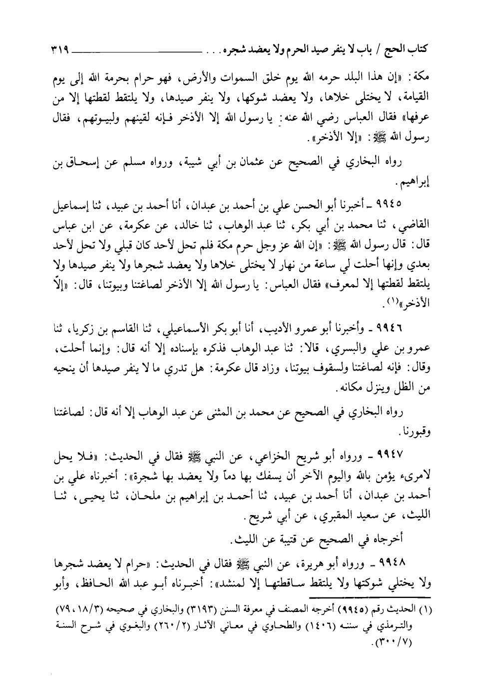 9948 - وَرَوَاهُ أَبُو هُرَيْرَةَ , عَنِ النَّبِيِّ صَلَّى اللهُ عَلَيْهِ وَسَلَّمَ فَقَالَ فِي الْحَدِيثِ: §" حَرَامٌ لَا يُعْضَدُ شَجَرُهَا وَلَا يُخْتَلَى شَوْكَتُهَا , وَلَا يُلْتَقَطُ سَاقِطَتُهَا إِلَّا لِمُنْشِدٍ " أَخْبَرَنَاهُ أَبُو عَبْدِ اللهِ الْحَافِظُ وَأَبُو -[320]- عَبْدِ الرَّحْمَنِ السُّلَمِيُّ , وَأَبُو عَبْدِ اللهِ السُّوسِيُّ , قَالُوا: ثنا أَبُو الْعَبَّاسِ , أنا الْعَبَّاسُ بْنُ الْوَلِيدِ , أنا أَبِي , ثنا الْأَوْزَاعِيُّ , ثنا يَحْيَى بْنُ أَبِي كَثِيرٍ , حَدَّثَنِي أَبُو سَلَمَةَ بْنُ عَبْدِ الرَّحْمَنِ , حَدَّثَنِي أَبُو هُرَيْرَةَ فَذَكَرَهُ. وَقَالَ: فَقَالَ الْعَبَّاسُ بْنُ عَبْدِ الْمُطَّلِبِ رَضِيَ اللهُ عَنْهُ: يَا رَسُولَ اللهِ إِلَّا الْإِذْخِرَ فَإِنَّا نَجْعَلُهُ فِي مَسَاكِنِنَا وَقُبُورِنَا , فَقَالَ رَسُولُ اللهِ صَلَّى اللهُ عَلَيْهِ وَسَلَّمَ: " إِلَّا الْإِذْخِرَ إِلَّا الْإِذْخِرَ " كَذَا قَالَ الْوَلِيدُ بْنُ مَزْيَدٍ , عَنِ الْأَوْزَاعِيِّ , وَرَوَاهُ الْوَلِيدُ بْنُ مُسْلِمٍ , عَنِ الْأَوْزَاعِيِّ , فَقَالَ فِي الْحَدِيثِ: " فَلَا يُنَفَّرُ صَيْدُهَا وَلَا يُخْتَلَى شَوْكُهَا وَلَا تَحِلُّ سَاقِطَتُهَا إِلَّا لِمُنْشِدٍ " , وَفِي رِوَايَةٍ أُخْرَى عَنْهُ: " لَا يُعْضَدُ شَجَرُهَا , وَلَا يُنَفَّرُ صَيْدُهَا وَلَا تَحِلُّ لُقَطَتُهَا إِلَّا لِمُنْشِدٍ " , وَرَوَاهُ شَيْبَانُ , عَنْ يَحْيَى , فَقَالَ فِي الْحَدِيثِ: " لَا يُخْبَطُ شَوْكُهَا , وَلَا يُعْضَدُ شَجَرُهَا , وَلَا يَلْتَقِطُ سَاقِطَتَهَا إِلَّا الْمُنْشِدُ " , وَكُلُّ ذَلِكَ يَرِدُ فِي مَوَاضِعِهِ مِنَ الْكِتَابِ إِنْ شَاءَ اللهُ