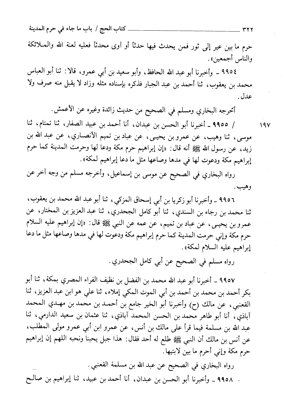 9956 - وَأَخْبَرَنَا أَبُو زَكَرِيَّا بْنُ أَبِي إِسْحَاقَ الْمُزَكِّي , ثنا أَبُو عَبْدِ اللهِ مُحَمَّدُ بْنُ يَعْقُوبَ , ثنا مُحَمَّدُ بْنُ رَجَاءِ بْنِ السِّنْدِيِّ , ثنا أَبُو كَامِلٍ الْجَحْدَرِيُّ , ثنا عَبْدُ الْعَزِيزِ بْنُ الْمُخْتَارِ , عَنْ عَمْرِو بْنِ يَحْيَى , عَنْ عَبَّادِ بْنِ تَمِيمٍ , عَنْ عَمِّهِ , عَنِ النَّبِيِّ صَلَّى اللهُ عَلَيْهِ وَسَلَّمَ , قَالَ: §" إِنَّ إِبْرَاهِيمَ عَلَيْهِ السَّلَامُ حَرَّمَ مَكَّةَ وَإِنِّي حَرَّمْتُ الْمَدِينَةَ كَمَا حَرَّمَ إِبْرَاهِيمُ مَكَّةَ وَدَعَوْتُ لَهَا فِي مُدِّهَا وَصَاعِهَا مِثْلَ مَا دَعَا إِبْرَاهِيمُ عَلَيْهِ السَّلَامُ لِمَكَّةَ " رَوَاهُ مُسْلِمٌ فِي الصَّحِيحِ عَنْ أَبِي كَامِلٍ الْجَحْدَرِيِّ