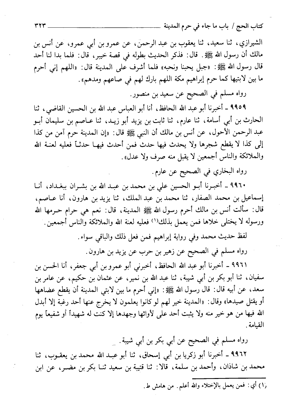9960 - أَخْبَرَنَا أَبُو الْحُسَيْنِ عَلِيُّ بْنُ مُحَمَّدِ بْنِ عَبْدِ اللهِ بْنِ بِشْرَانَ بِبَغْدَادَ , أنا إِسْمَاعِيلُ بْنُ مُحَمَّدٍ الصَّفَّارُ , ثنا مُحَمَّدُ بْنُ عَبْدِ الْمَلِكِ , ثنا يَزِيدُ بْنُ هَارُونَ , أنا عَاصِمٌ , قَالَ: سَأَلْتُ أَنَسَ بْنَ مَالِكٍ §أَحَرَّمَ رَسُولُ اللهِ صَلَّى اللهُ عَلَيْهِ وَسَلَّمَ الْمَدِينَةَ؟ قَالَ: " نَعَمْ هِيَ حَرَامٌ حَرَّمَهَا اللهُ وَرَسُولُهُ , لَا يُخْتَلَى خَلَاهَا فَمَنْ يَعْمَلْ بِذَلِكَ فَعَلَيْهِ لَعْنَةُ اللهِ وَالْمَلَائِكَةِ وَالنَّاسِ أَجْمَعِينَ " لَفْظُ حَدِيثِ مُحَمَّدٍ وَفِي رِوَايَةِ إِبْرَاهِيمَ فَمَنْ فَعَلَ ذَلِكَ وَالْبَاقِي سَوَاءٌ , رَوَاهُ مُسْلِمٌ فِي الصَّحِيحِ عَنْ زُهَيْرِ بْنِ حَرْبٍ , عَنْ يَزِيدَ بْنِ هَارُونَ