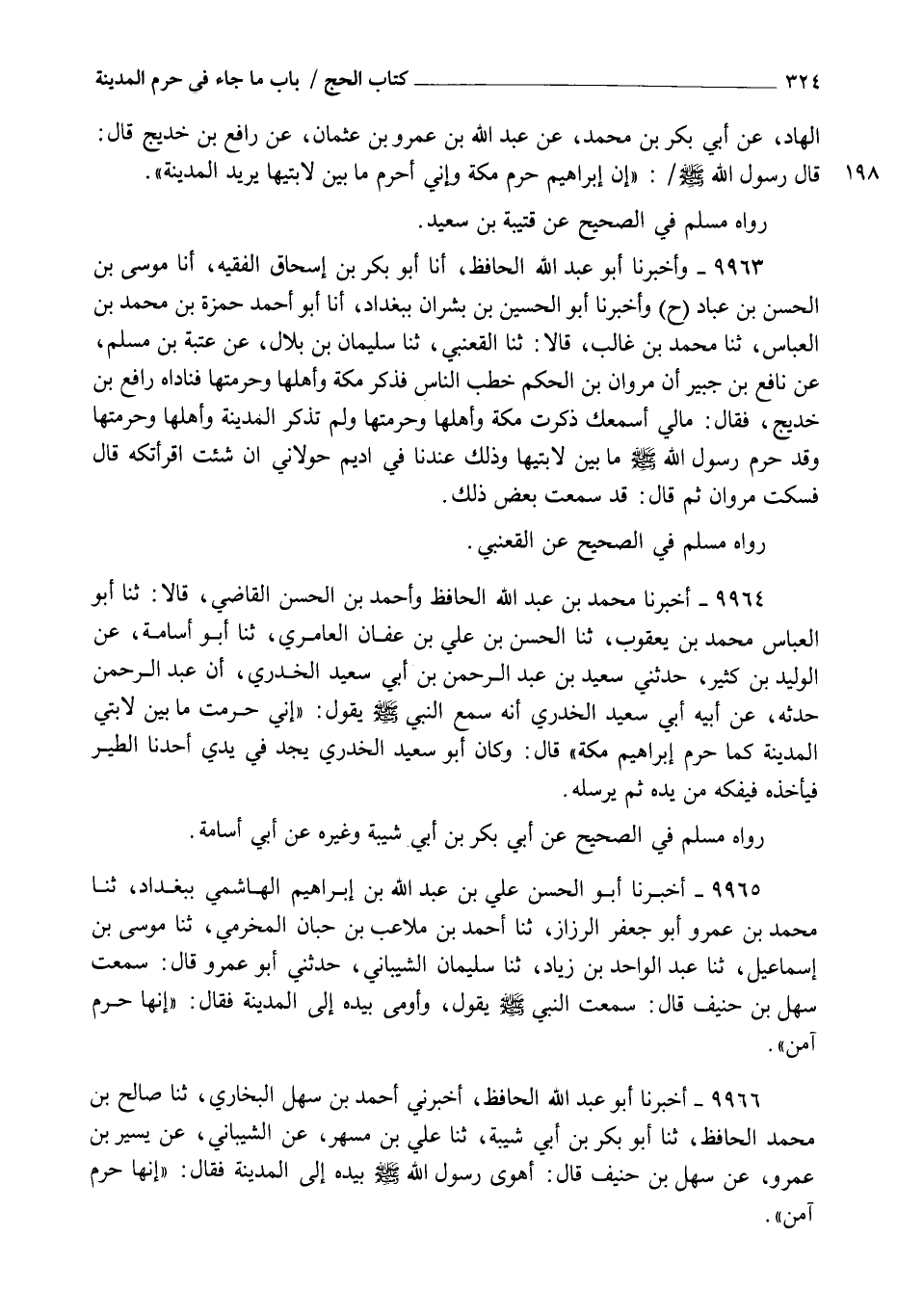 9964 - أَخْبَرَنَا مُحَمَّدُ بْنُ عَبْدِ اللهِ الْحَافِظُ , وَأَحْمَدُ بْنُ الْحَسَنِ الْقَاضِي , قَالَا: ثنا أَبُو الْعَبَّاسِ مُحَمَّدُ بْنُ يَعْقُوبَ , ثنا الْحَسَنُ بْنُ عَلِيِّ بْنِ عَفَّانَ الْعَامِرِيُّ , ثنا أَبُو أُسَامَةَ , عَنِ الْوَلِيدِ بْنِ كَثِيرٍ , حَدَّثَنِي سَعِيدُ بْنُ عَبْدِ الرَّحْمَنِ بْنِ أَبِي سَعِيدٍ الْخُدْرِيِّ أَنَّ عَبْدَ الرَّحْمَنِ , حَدَّثَهُ عَنْ أَبِيهِ أَبِي سَعِيدٍ الْخُدْرِيِّ أَنَّهُ سَمِعَ النَّبِيَّ صَلَّى اللهُ عَلَيْهِ وَسَلَّمَ , يَقُولُ: §" إِنِّي حَرَّمْتُ مَا بَيْنَ لَابَتَيِ الْمَدِينَةِ كَمَا حَرَّمَ إِبْرَاهِيمُ مَكَّةَ " قَالَ: وَكَانَ أَبُو سَعِيدٍ الْخُدْرِيُّ يَجِدُ فِي يَدَيْ أَحَدِنَا الطَّيْرَ فَيَأْخُذُهُ فَيَفُكُّهُ مِنْ يَدِهِ ثُمَّ يُرْسِلُهُ. رَوَاهُ مُسْلِمٌ فِي الصَّحِيحِ عَنْ أَبِي بَكْرِ بْنِ أَبِي شَيْبَةَ وَغَيْرِهِ , عَنْ أَبِي أُسَامَةَ