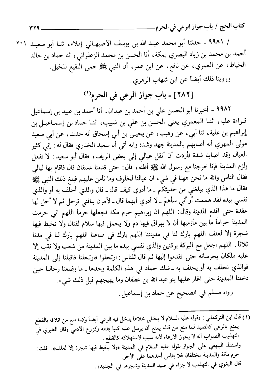 9981 - حَدَّثَنَا أَبُو مُحَمَّدٍ عَبْدُ اللهِ بْنُ يُوسُفَ الْأَصْبَهَانِيُّ , إِمْلَاءً , ثنا أَبُو سَعِيدٍ أَحْمَدُ بْنُ مُحَمَّدِ بْنِ زِيَادٍ الْبَصْرِيُّ بِمَكَّةَ , أنا الْحَسَنُ بْنُ مُحَمَّدٍ الزَّعْفَرَانِيُّ , ثنا حَمَّادُ بْنُ خَالِدٍ الْخَيَّاطُ , عَنِ الْعُمَرِيِّ , عَنْ نَافِعٍ , عَنِ ابْنِ عُمَرَ " أَنَّ النَّبِيَّ صَلَّى اللهُ عَلَيْهِ وَسَلَّمَ §حَمَى الْبَقِيعَ لِلْخَيْلِ " وَرُوِّينَا ذَلِكَ أَيْضًا عَنِ ابْنِ شِهَابٍ الزُّهْرِيِّ