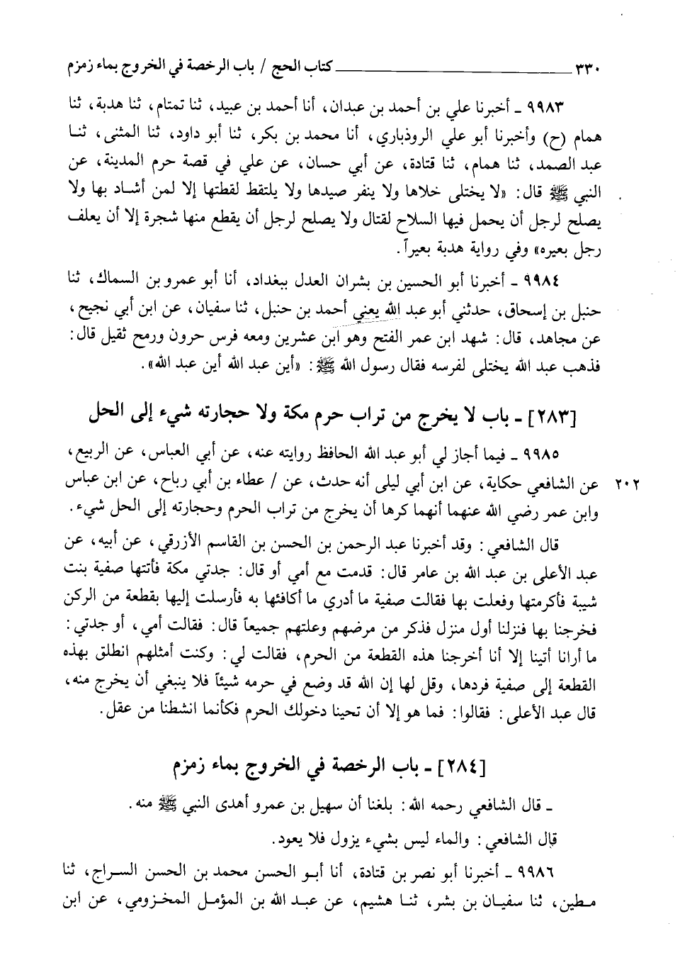 9985 - قَالَ الشَّافِعِيُّ: وَقَدْ أَخْبَرَنَا عَبْدُ الرَّحْمَنِ بْنُ الْحَسَنِ بْنِ الْقَاسِمِ الْأَزْرَقِيُّ , عَنْ أَبِيهِ , عَنْ عَبْدِ الْأَعْلَى بْنِ عَبْدِ اللهِ بْنِ عَامِرٍ , قَالَ: قَدِمْتُ مَعَ أُمِّي , أَوْ قَالَ: جَدَّتِي مَكَّةَ فَأَتَتْهَا صَفِيَّةُ بِنْتُ شَيْبَةَ فَأَكْرَمَتْهَا وَفَعَلَتْ بِهَا فَقَالَتْ صَفِيَّةُ: " مَا أَدْرِي مَا أُكَافِئُهَا بِهِ " فَأَرْسَلَتْ إِلَيْهَا بِقِطْعَةٍ مِنَ الرُّكْنِ فَخَرَجْنَا بِهَا فَنَزَلْنَا أَوَّلَ مَنْزِلٍ فَذَكَرَ مِنْ مَرَضِهِمْ وَعِلَّتِهِمْ جَمِيعًا , قَالَ: فَقَالَتْ أُمِّي , أَوْ جَدَّتِي: مَا أُرَانَا أُتِينَا إِلَّا أَنَّا أَخْرَجْنَا هَذِهِ الْقِطْعَةَ مِنَ الْحَرَمِ , فَقَالَتْ لِي وَكُنْتُ أَمْثَلَهُمْ: انْطَلِقْ بِهَذِهِ الْقِطْعَةِ إِلَى صَفِيَّةَ فَرُدَّهَا وَقُلْ لَهَا: §إِنَّ اللهَ قَدْ وَضَعَ فِي حَرَمِهِ شَيْئًا فَلَا يَنْبَغِي أَنْ يُخْرَجَ مِنْهُ , قَالَ عَبْدُ الْأَعْلَى: فَقَالُوا: فَمَا هُوَ إِلَّا أَنْ تَحَيَّنَّا دُخُولَكَ الْحَرَمَ فَكَأَنَّمَا أُنْشِطْنَا مِنْ عَقْلٍ