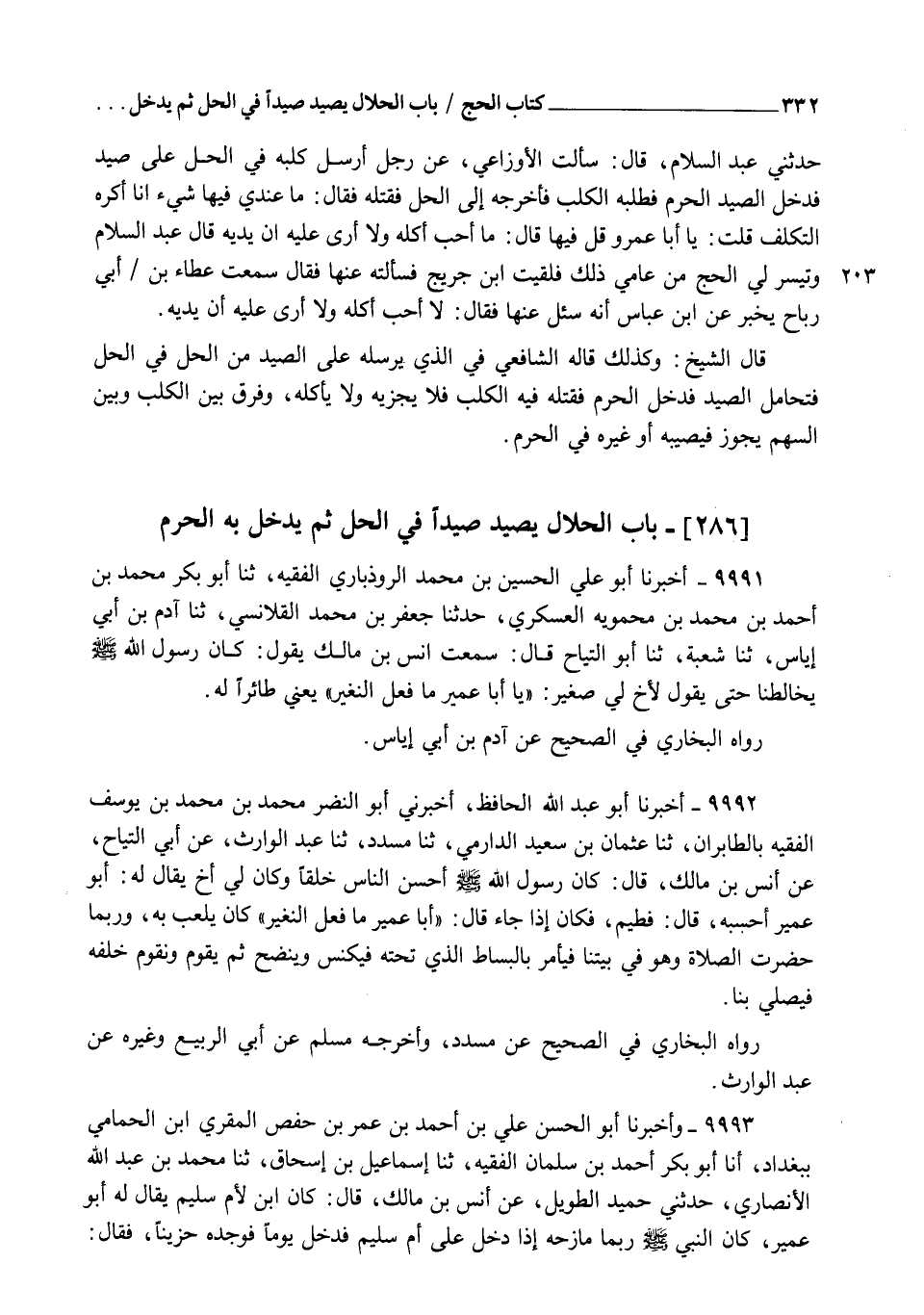 9993 - وَأَخْبَرَنَا أَبُو الْحَسَنِ عَلِيُّ بْنُ أَحْمَدَ بْنِ عُمَرَ بْنِ حَفْصٍ الْمُقْرِئُ ابْنُ الْحَمَّامِيِّ بِبَغْدَادَ , أنا أَبُو بَكْرٍ أَحْمَدُ بْنُ سَلْمَانَ الْفَقِيهُ , ثنا إِسْمَاعِيلُ بْنُ إِسْحَاقَ , ثنا مُحَمَّدُ بْنُ عَبْدِ اللهِ الْأَنْصَارِيُّ , حَدَّثَنِي حُمَيْدٌ الطَّوِيلُ , عَنْ أَنَسِ بْنِ مَالِكٍ , قَالَ: كَانَ ابْنٌ لِأُمِّ سُلَيْمٍ يُقَالُ لَهُ أَبُو عُمَيْرٍ كَانَ النَّبِيُّ صَلَّى اللهُ عَلَيْهِ وَسَلَّمَ رُبَّمَا مَازَحَهُ إِذَا دَخَلَ عَلَى أُمِّ سُلَيْمٍ فَدَخَلَ يَوْمًا فَوَجَدَهُ حَزِينًا , فَقَالَ: " -[333]- مَا لِأَبِي عُمَيْرٍ حَزِينًا؟ " قَالُوا: يَا رَسُولَ اللهِ مَاتَ نُغَيْرُهُ الَّذِي كَانَ يَلْعَبُ بِهِ جَعَلَ النَّبِيُّ صَلَّى اللهُ عَلَيْهِ وَسَلَّمَ , يَقُولُ: " أَبَا عُمَيْرٍ §مَا فَعَلَ النُّغَيْرُ؟ "