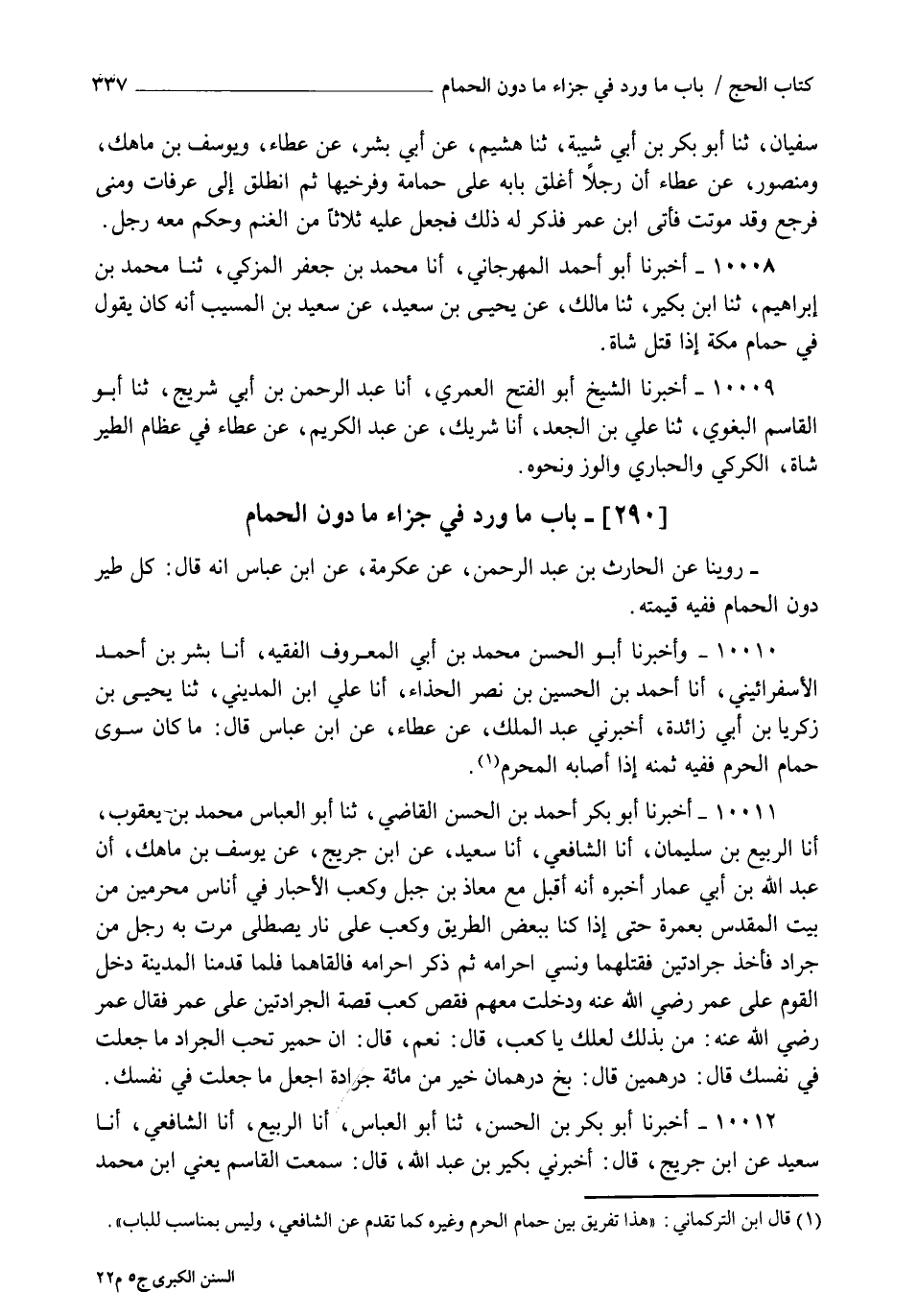 10008 - أَخْبَرَنَا أَبُو أَحْمَدَ الْمِهْرَجَانِيُّ , أنا مُحَمَّدُ بْنُ جَعْفَرٍ الْمُزَكِّي , ثنا مُحَمَّدُ بْنُ إِبْرَاهِيمَ , ثنا ابْنُ بُكَيْرٍ , ثنا مَالِكٌ , عَنْ يَحْيَى بْنِ سَعِيدٍ , عَنْ سَعِيدِ بْنِ الْمُسَيِّبِ أَنَّهُ كَانَ §يَقُولُ: " فِي حَمَامِ مَكَّةَ إِذَا قُتِلَ شَاةٌ "