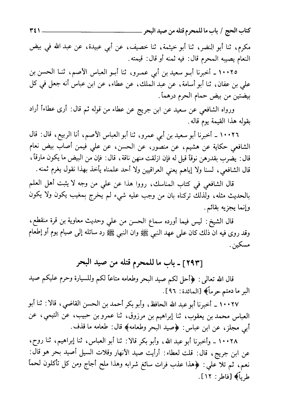 10027 - أَخْبَرَنَا أَبُو عَبْدِ اللهِ الْحَافِظُ , وَأَبُو بَكْرٍ أَحْمَدُ بْنُ الْحَسَنِ الْقَاضِي قَالَا: ثنا أَبُو الْعَبَّاسِ مُحَمَّدُ بْنُ يَعْقُوبَ , ثنا إِبْرَاهِيمُ بْنُ مَرْزُوقٍ , ثنا عَمْرُو بْنُ حَبِيبٍ , عَنِ التَّيْمِيِّ , عَنْ أَبِي مِجْلَزٍ , عَنِ ابْنِ عَبَّاسٍ: {§صَيْدُ الْبَحْرِ وَطَعَامُهُ} [المائدة: 96] قَالَ: " طَعَامُهُ مَا قَذَفَ "