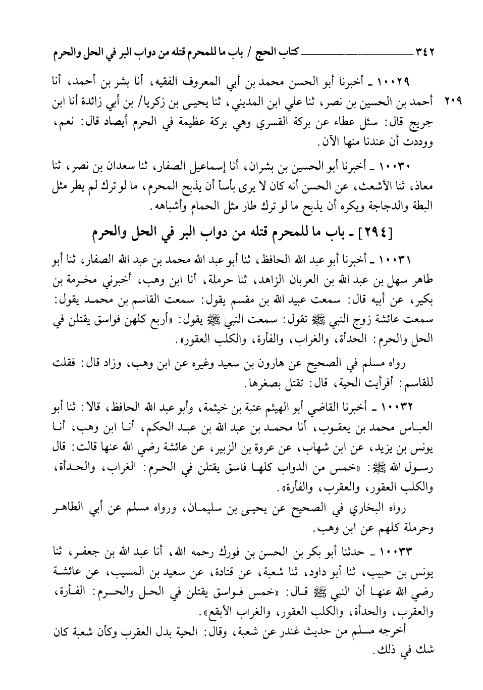 10031 - أَخْبَرَنَا أَبُو عَبْدِ اللهِ الْحَافِظُ , ثنا أَبُو عَبْدُ اللهِ مُحَمَّدُ بْنُ عَبْدِ اللهِ الصَّفَّارُ ثنا أَبُو طَاهِرٍ سَهْلُ بْنُ عَبْدِ اللهِ بْنِ الْعُرْبَانِ الزَّاهِدُ , ثنا حَرْمَلَةُ , أنا ابْنُ وَهْبٍ , أَخْبَرَنِي مَخْرَمَةُ بْنُ بُكَيْرٍ , عَنْ أَبِيهِ , قَالَ: سَمِعْتُ عُبَيْدَ اللهِ بْنَ مِقْسَمٍ , يَقُولُ: سَمِعْتُ الْقَاسِمَ بْنَ مُحَمَّدٍ , يَقُولُ: سَمِعْتُ عَائِشَةَ زَوْجَ النَّبِيِّ صَلَّى اللهُ عَلَيْهِ وَسَلَّمَ تَقُولُ: سَمِعْتُ النَّبِيَّ صَلَّى اللهُ عَلَيْهِ وَسَلَّمَ يَقُولُ: " §أَرْبَعٌ كُلُّهُنَّ فَوَاسِقُ يُقْتَلْنَ فِي الْحِلِّ وَالْحَرَمِ: الْحَدَأَةُ وَالْغُرَابُ وَالْفَأْرَةُ وَالْكَلْبُ الْعَقُورُ " رَوَاهُ مُسْلِمٌ فِي الصَّحِيحِ عَنْ هَارُونَ بْنِ سَعِيدٍ وَغَيْرِهِ , عَنِ ابْنِ وَهْبٍ , وَزَادَ قَالَ: فَقُلْتُ لِلْقَاسِمِ: أَفَرَأَيْتَ الْحَيَّةَ , قَالَ: تُقْتَلُ بِصِغَرِهَا