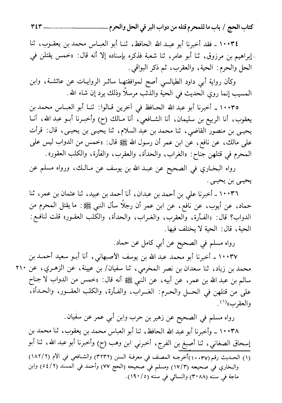 10035 - أَخْبَرَنَا أَبُو عَبْدِ اللهِ الْحَافِظُ , فِي آخَرِينَ , قَالُوا: ثنا أَبُو الْعَبَّاسِ مُحَمَّدُ بْنُ يَعْقُوبَ , أنا الرَّبِيعُ بْنُ سُلَيْمَانَ , أنا الشَّافِعِيُّ , أنا مَالِكٌ , ح وَأَخْبَرَنَا أَبُو عَبْدِ اللهِ , أنا يَحْيَى بْنُ مَنْصُورٍ الْقَاضِي , ثنا مُحَمَّدُ بْنُ عَبْدِ السَّلَامِ , ثنا يَحْيَى بْنُ يَحْيَى , قَالَ: قَرَأْتُ عَلَى مَالِكٍ , عَنْ نَافِعٍ , عَنِ ابْنِ عُمَرَ أَنَّ رَسُولَ اللهِ صَلَّى اللهُ عَلَيْهِ وَسَلَّمَ , قَالَ: §" خَمْسٌ مِنَ الدَّوَابِّ لَيْسَ عَلَى الْمُحْرِمِ فِي قَتْلِهِنَّ جُنَاحٌ: الْغُرَابُ , وَالْحِدَأَةُ , وَالْعَقْرَبُ , وَالْفَأْرَةُ , وَالْكَلْبُ الْعَقُورُ " رَوَاهُ الْبُخَارِيُّ فِي الصَّحِيحِ عَنْ عَبْدِ اللهِ بْنِ يُوسُفَ , عَنْ مَالِكٍ , وَرَوَاهُ مُسْلِمٌ عَنْ يَحْيَى بْنِ يَحْيَى