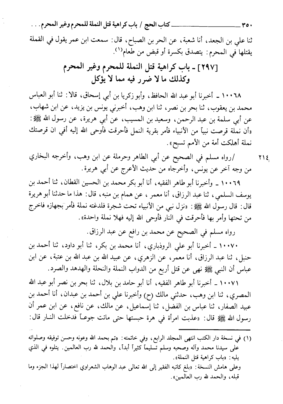 10068 - أَخْبَرَنَا أَبُو عَبْدِ اللهِ الْحَافِظُ , وَأَبُو زَكَرِيَّا بْنُ أَبِي إِسْحَاقَ قَالَا: ثنا أَبُو الْعَبَّاسِ مُحَمَّدُ بْنُ يَعْقُوبَ , ثنا بَحْرُ بْنُ نَصْرٍ , ثنا ابْنُ وَهْبٍ , أَخْبَرَنِي يُونُسُ بْنُ يَزِيدَ , عَنِ ابْنِ شِهَابٍ , عَنْ أَبِي سَلَمَةَ بْنِ عَبْدِ الرَّحْمَنِ , وَسَعِيدِ بْنِ الْمُسَيِّبِ , عَنْ أَبِي هُرَيْرَةَ , عَنْ رَسُولِ اللهِ صَلَّى اللهُ عَلَيْهِ وَسَلَّمَ: §" أَنَّ النَّمْلَةَ قَرَصَتْ نَبِيًّا مِنَ الْأَنْبِيَاءِ , فَأَمَرَ بِقَرْيَةِ النَّمْلِ فَأُحْرِقَتْ فَأَوْحَى اللهُ إِلَيْهِ: أَفِي أَنْ قَرَصَتْكَ نَمْلَةٌ أَهْلَكْتَ أُمَّةً مِنَ الْأُمَمِ تُسَبِّحُ؟ " رَوَاهُ مُسْلِمٌ فِي الصَّحِيحِ عَنْ أَبِي الطَّاهِرِ , وَحَرْمَلَةَ , عَنِ ابْنِ وَهْبٍ , وَأَخْرَجَهُ الْبُخَارِيُّ مِنْ وَجْهٍ آخَرَ , عَنْ يُونُسَ , وَأَخْرَجَاهُ مِنْ حَدِيثِ الْأَعْرَجِ , عَنْ أَبِي هُرَيْرَةَ