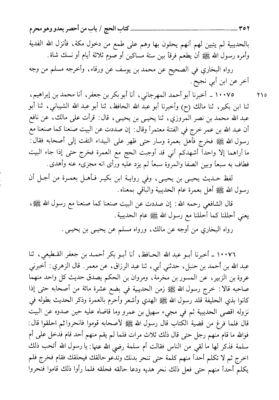 10076 - أَخْبَرَنَا أَبُو عَبْدِ اللهِ الْحَافِظُ , أنا أَبُو بَكْرٍ أَحْمَدُ بْنُ جَعْفَرٍ الْقَطِيعِيُّ ثنا عَبْدُ اللهِ بْنُ أَحْمَدَ بْنِ حَنْبَلٍ , حَدَّثَنِي أَبِي , ثنا عَبْدُ الرَّزَّاقِ , عَنْ مَعْمَرٍ , قَالَ الزُّهْرِيُّ: أَخْبَرَنِي عُرْوَةُ بْنُ الزُّبَيْرِ , عَنِ الْمِسْوَرِ بْنِ مَخْرَمَةَ , وَمَرْوَانَ بْنِ الْحَكَمِ يُصَدِّقُ حَدِيثُ كُلِّ وَاحِدٍ مِنْهُمَا صَاحِبَهُ قَالَا: خَرَجَ رَسُولُ اللهِ صَلَّى اللهُ عَلَيْهِ وَسَلَّمَ زَمَنَ الْحُدَيْبِيَةِ فِي بِضْعَ عَشْرَةَ مِائَةٍ مِنْ أَصْحَابِهِ حَتَّى إِذَا كَانُوا بِذِي الْحُلَيْفَةِ قَلَّدَ رَسُولُ اللهِ صَلَّى اللهُ عَلَيْهِ وَسَلَّمَ الْهَدْيَ وَأَشْعَرَ , وَأَحْرَمَ بِالْعُمْرَةِ وَذَكَرَ الْحَدِيثَ بِطُولِهِ فِي نُزُولِهِ أَقْصَى الْحُدَيْبِيَةِ ثُمَّ فِي مَجِيءِ سُهَيْلِ بْنِ عَمْرٍو وَمَا قَاضَاهُ عَلَيْهِ حِينَ صَدُّوهُ , عَنِ الْبَيْتِ , قَالَ: فَلَمَّا فَرَغَ مِنْ قَضِيَّةِ الْكِتَابِ , قَالَ رَسُولُ اللهِ صَلَّى اللهُ عَلَيْهِ وَسَلَّمَ لِأَصْحَابِهِ: " §قُومُوا فَانْحَرُوا ثُمَّ احْلِقُوا " قَالَ: فَوَاللهِ مَا قَامَ مِنْهُمْ رَجُلٌ حَتَّى قَالَ ذَلِكَ ثَلَاثَ مَرَّاتٍ , فَلَمَّا لَمْ يَقُمْ مِنْهُمْ أَحَدٌ قَامَ فَدَخَلَ عَلَى أُمِّ سَلَمَةَ فَذَكَرَ لَهَا مَا لَقِيَ مِنَ النَّاسِ , فَقَالَتْ أُمُّ سَلَمَةَ رَضِيَ اللهُ عَنْهَا: يَا رَسُولَ اللهِ أَتُحِبُّ ذَلِكَ؟ اخْرُجْ ثُمَّ لَا تُكَلِّمْ أَحَدًا مِنْهُمْ كَلِمَةً حَتَّى تَنْحَرَ بُدْنَكَ وَتَدْعُوَ حَالِقَكَ فَيَحْلِقَكَ , فَقَامَ فَخَرَجَ فَلَمْ يُكَلِّمْ أَحَدًا مِنْهُمْ حَتَّى فَعَلَ ذَلِكَ نَحَرَ هَدْيَهُ وَدَعَا حَالِقَهُ فَحَلَقَهُ , فَلَمَّا رَأَوْا ذَلِكَ قَامُوا فَنَحَرُوا , -[353]- وَجَعَلَ بَعْضُهُمْ يَحْلِقُ لِبَعْضٍ حَتَّى كَادَ بَعْضُهُمْ يَقْتُلُ بَعْضًا غَمًّا رَوَاهُ الْبُخَارِيُّ فِي الصَّحِيحِ عَنْ عَبْدِ اللهِ بْنِ مُحَمَّدٍ , عَنْ عَبْدِ الرَّزَّاقِ
