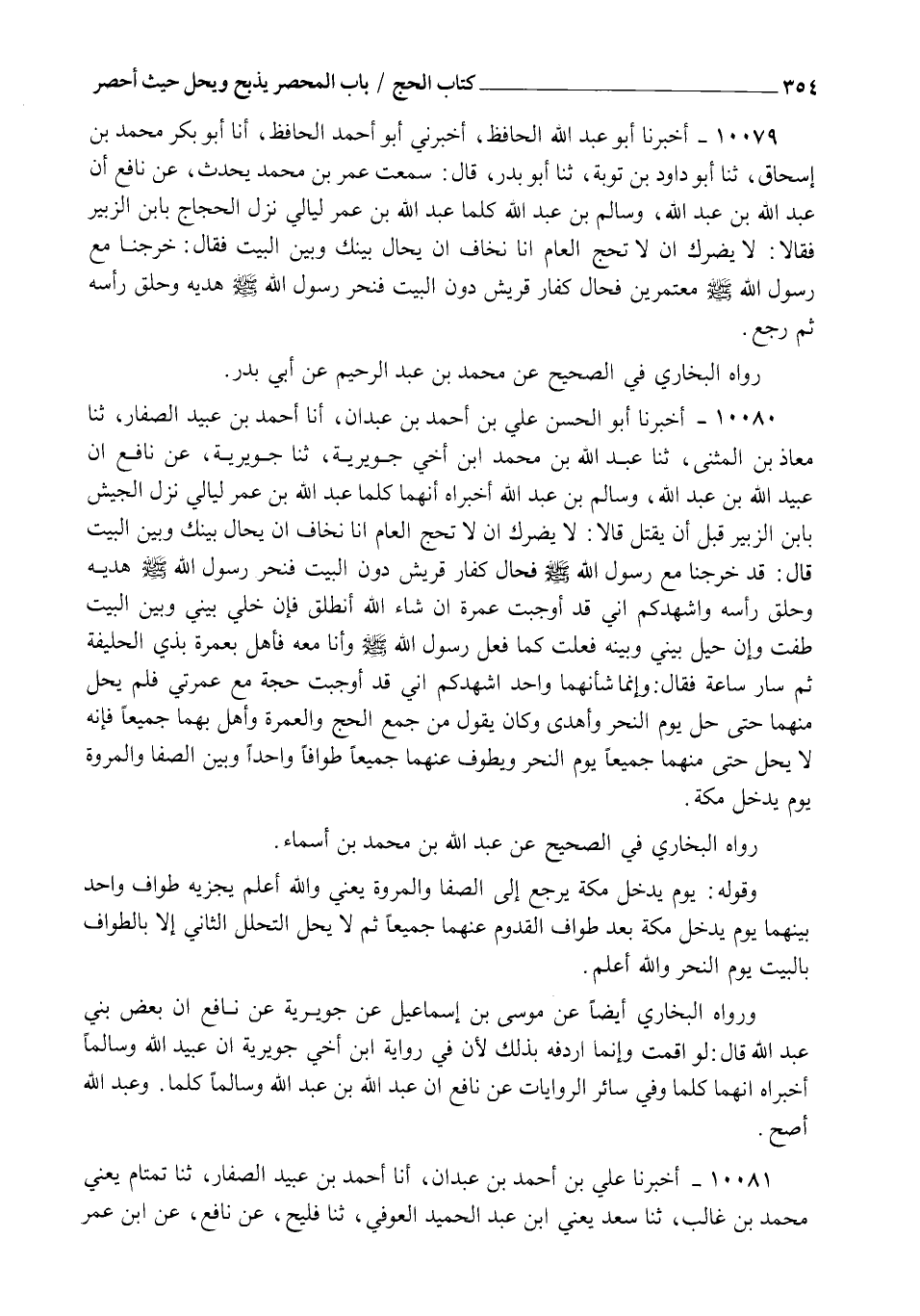 10080 - أَخْبَرَنَا أَبُو الْحَسَنِ عَلِيُّ بْنُ أَحْمَدَ بْنِ عَبْدَانَ , أنا أَحْمَدُ بْنُ عُبَيْدٍ الصَّفَّارُ , ثنا مُعَاذُ بْنُ الْمُثَنَّى , ثنا عَبْدُ اللهِ بْنُ مُحَمَّدٍ ابْنُ أَخِي جُوَيْرِيَةَ , ثنا جُوَيْرِيَةُ , عَنْ نَافِعٍ أَنَّ عُبَيْدَ اللهِ بْنَ عَبْدِ اللهِ , وَسَالِمَ بْنَ عَبْدِ اللهِ , أَخْبَرَاهُ أَنَّهُمَا كَلَّمَا عَبْدَ اللهِ بْنَ عُمَرَ لَيَالِيَ نَزَلَ الْجَيْشُ بِابْنِ الزُّبَيْرِ قَبْلَ أَنْ يُقْتَلَ قَالَا: §لَا يَضُرُّكَ أَنْ لَا تَحُجَّ الْعَامَ , إِنَّا نَخَافُ أَنْ يُحَالَ بَيْنَكَ وَبَيْنَ الْبَيْتِ , قَالَ: " قَدْ خَرَجْنَا مَعَ رَسُولِ اللهِ صَلَّى اللهُ عَلَيْهِ وَسَلَّمَ فَحَالَ كُفَّارُ قُرَيْشٍ دُونَ الْبَيْتِ فَنَحَرَ رَسُولُ اللهِ صَلَّى اللهُ عَلَيْهِ وَسَلَّمَ هَدْيَهُ , وَحَلَقَ رَأْسَهُ , وَأُشْهِدُكُمْ أَنِّي قَدْ أَوْجَبْتُ عُمْرَةً إِنْ شَاءَ اللهُ أَنْطَلِقُ فَإِنْ خُلِّيَ بَيْنِي وَبَيْنَ الْبَيْتِ طُفْتُ , وَإِنْ حِيلَ بَيْنِي وَبَيْنَهُ فَعَلْتُ كَمَا فَعَلَ رَسُولُ اللهِ صَلَّى اللهُ عَلَيْهِ وَسَلَّمَ وَأَنَا مَعَهُ " فَأَهَلَّ بِعُمْرَةٍ بِذِي الْحُلَيْفَةِ ثُمَّ سَارَ سَاعَةً , فَقَالَ: " إِنَّمَا شَأْنُهُمَا وَاحِدٌ , أُشْهِدُكُمْ أَنِّي قَدْ أَوْجَبْتُ حَجَّةً مَعَ عُمْرَتِي " , فَلَمْ يَحِلَّ مِنْهُمَا حَتَّى حَلَّ يَوْمُ النَّحْرِ وَأَهْدَى وَكَانَ يَقُولُ: " مَنْ جَمَعَ الْحَجَّ وَالْعُمْرَةَ وَأَهَلَّ بِهِمَا جَمِيعًا , فَإِنَّهُ لَا يَحِلُّ حَتَّى يَحِلَّ مِنْهُمَا جَمِيعًا يَوْمَ النَّحْرِ , وَيَطُوفُ عَنْهُمَا جَمِيعًا طَوَافًا وَاحِدًا وَبَيْنَ الصَّفَا وَالْمَرْوَةِ يَوْمَ يَدْخُلُ مَكَّةَ " رَوَاهُ الْبُخَارِيُّ فِي الصَّحِيحِ عَنْ عَبْدِ اللهِ بْنِ مُحَمَّدِ بْنِ أَسْمَاءَ , وَقَوْلُهُ: " يَوْمَ يَدْخُلُ مَكَّةَ يَرْجِعُ إِلَى الصَّفَا وَالْمَرْوَةِ " يَعْنِي وَاللهُ أَعْلَمُ يُجْزِيهِ طَوَافٌ وَاحِدٌ بَيْنَهُمَا يَوْمَ يَدْخُلُ مَكَّةَ بَعْدَ طَوَافِ الْقُدُومِ عَنْهُمَا جَمِيعًا , ثُمَّ لَا يَحِلُّ التَّحَلُّلَ الثَّانِي إِلَّا بِالطَّوَافِ بِالْبَيْتِ يَوْمَ النَّحْرِ وَاللهُ أَعْلَمُ , وَرَوَاهُ الْبُخَارِيُّ أَيْضًا عَنْ مُوسَى بْنِ إِسْمَاعِيلَ , عَنْ جُوَيْرِيَةَ , عَنْ نَافِعٍ أَنَّ بَعْضَ بَنِي عَبْدِ اللهِ , قَالَ: لَوْ أَقَمْتَ , وَإِنَّمَا أَرْدَفَهُ بِذَلِكَ؛ لِأَنَّ فِي رِوَايَةِ ابْنِ أَخِي جُوَيْرِيَةَ أَنَّ عُبَيْدَ اللهِ , وَسَالِمًا أَخْبَرَاهُ أَنَّهُمَا كَلَّمَا , وَفِي سَائِرِ الرِّوَايَاتِ عَنْ نَافِعٍ أَنَّ عَبْدَ اللهِ بْنَ عَبْدِ اللهِ , وَسَالِمًا كَلَّمَا، وَعَبْدُ اللهِ أَصَحُّ