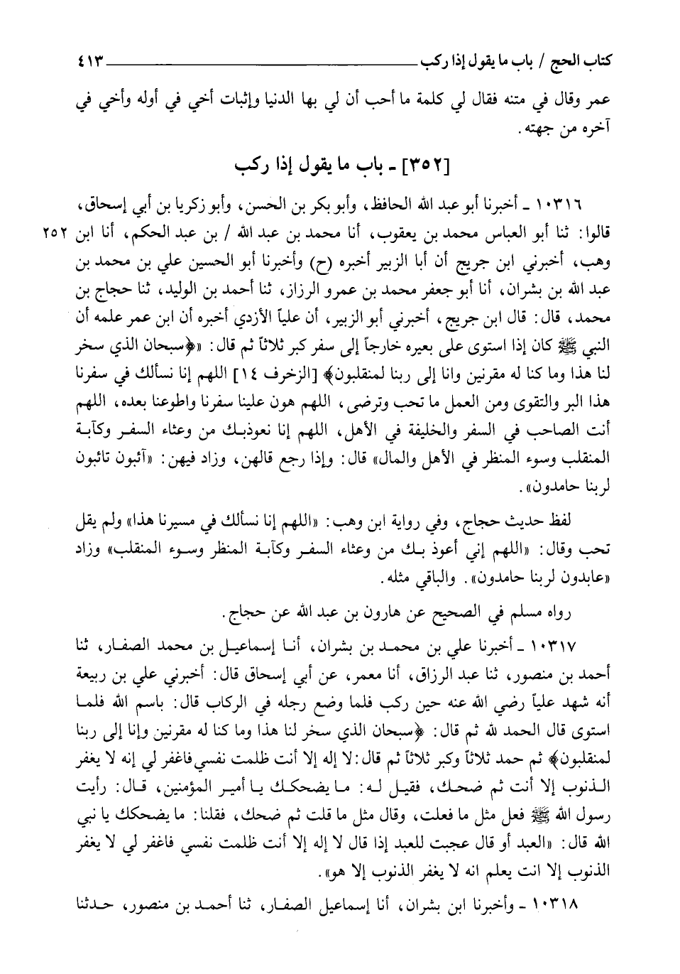 10316 - أَخْبَرَنَا أَبُو عَبْدِ اللهِ الْحَافِظُ , وَأَبُو بَكْرِ بْنُ الْحَسَنِ وَأَبُو زَكَرِيَّا بْنُ أَبِي إِسْحَاقَ , قَالُوا: ثنا أَبُو الْعَبَّاسِ مُحَمَّدُ بْنُ يَعْقُوبَ , أنا مُحَمَّدُ بْنُ عَبْدِ اللهِ بْنِ عَبْدِ الْحَكَمِ , أنا ابْنُ وَهْبٍ , أَخْبَرَنِي ابْنُ جُرَيْجٍ أَنَّ أَبَا الزُّبَيْرِ أَخْبَرَهُ، ح وَأَخْبَرَنَا أَبُو الْحُسَيْنِ عَلِيُّ بْنُ مُحَمَّدِ بْنِ عَبْدِ اللهِ بْنِ بِشْرَانَ , أنا أَبُو جَعْفَرٍ مُحَمَّدُ بْنُ عَمْرٍو الرَّزَّازُ , ثنا أَحْمَدُ بْنُ الْوَلِيدِ , ثنا حَجَّاجُ بْنُ مُحَمَّدٍ , قَالَ: قَالَ ابْنُ جُرَيْجٍ: أَخْبَرَنِي أَبُو الزُّبَيْرِ , أَنَّ عَلِيًّا الْأَزْدِيَّ , أَخْبَرَهُ أَنَّ ابْنَ عُمَرَ عَلَّمَهُ أَنَّ النَّبِيَّ صَلَّى اللهُ عَلَيْهِ وَسَلَّمَ كَانَ إِذَا اسْتَوَى عَلَى بَعِيرِهِ خَارِجًا إِلَى سَفَرٍ كَبَّرَ ثَلَاثًا ثُمَّ قَالَ: " {§سُبْحَانَ الَّذِي سَخَّرَ لَنَا هَذَا وَمَا كُنَّا لَهُ مُقْرِنِينَ وَإِنَّا إِلَى رَبِّنَا لَمُنْقَلِبُونَ} [الزخرف: 14] , اللهُمَّ إِنَّا نَسْأَلُكَ فِي سَفَرِنَا هَذَا الْبِرَّ وَالتَّقْوَى , وَمِنَ الْعَمَلِ مَا تُحِبُّ وَتَرْضَى , اللهُمَّ هُوِّنْ عَلَيْنَا سَفَرَنَا وَاطْوِ عَنَّا بُعْدَهُ , اللهُمَّ أَنْتَ الصَّاحِبُ فِي السَّفَرِ , وَالْخَلِيفَةُ فِي الْأَهْلِ , اللهُمَّ إِنَّا نَعُوذُ بِكَ مِنْ وَعْثَاءِ السَّفَرِ وَكَآبَةِ الْمُنْقَلَبِ , وَسُوءِ الْمَنْظَرِ فِي الْأَهْلِ وَالْمَالِ " قَالَ: وَإِذَا رَجَعَ قَالَهُنَّ وَزَادَ فِيهِنَّ: " آئِبُونَ تَائِبُونَ لِرَبِّنَا حَامِدُونَ " لَفْظُ حَدِيثِ حَجَّاجٍ , وَفِي رِوَايَةِ ابْنِ وَهْبٍ: " اللهُمَّ إِنَّا نَسْأَلُكَ فِي مَسِيرِنَا هَذَا " وَلَمْ يَقُلْ " تُحِبُّ " , وَقَالَ: " اللهُمَّ إِنِّي أَعُوذُ بِكَ مِنْ وَعْثَاءِ السَّفَرِ , وَكَآبَةِ الْمَنْظَرِ وَسُوءِ الْمُنْقَلَبِ " وَزَادَ: " عَابِدُونَ لِرَبِّنَا حَامِدُونَ " , وَالْبَاقِي مِثْلُهُ رَوَاهُ مُسْلِمٌ فِي الصَّحِيحِ عَنْ هَارُونَ بْنِ عَبْدِ اللهِ , عَنْ حَجَّاجٍ