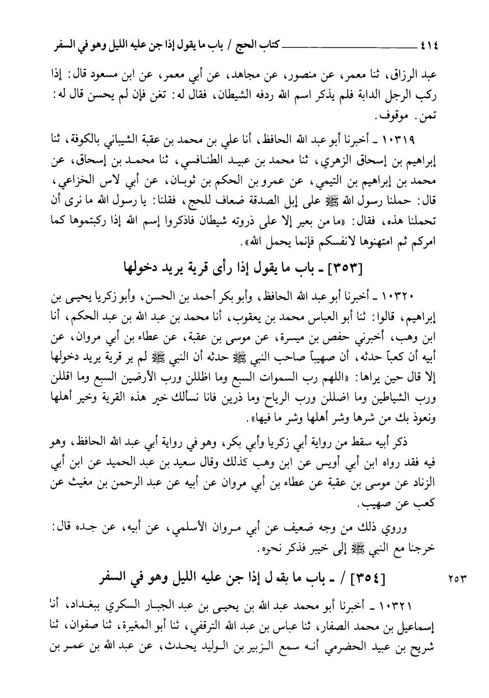 10320 - أَخْبَرَنَا أَبُو عَبْدِ اللهِ الْحَافِظُ , وَأَبُو بَكْرٍ أَحْمَدُ بْنُ الْحَسَنِ , وَأَبُو زَكَرِيَّا يَحْيَى بْنُ إِبْرَاهِيمَ , قَالُوا: ثنا أَبُو الْعَبَّاسِ مُحَمَّدُ بْنُ يَعْقُوبَ , أنا مُحَمَّدُ بْنُ عَبْدِ اللهِ بْنِ عَبْدِ الْحَكَمِ , أنا ابْنُ وَهْبٍ , أَخْبَرَنِي حَفْصُ بْنُ مَيْسَرَةَ , عَنْ مُوسَى بْنِ عُقْبَةَ , عَنْ عَطَاءِ بْنِ أَبِي مَرْوَانَ , عَنْ أَبِيهِ أَنَّ كَعْبًا , حَدَّثَهُ أَنَّ صُهَيْبًا صَاحِبَ النَّبِيِّ صَلَّى اللهُ عَلَيْهِ وَسَلَّمَ حَدَّثَهُ أَنَّ النَّبِيَّ صَلَّى اللهُ عَلَيْهِ وَسَلَّمَ لَمْ يَرَ قَرْيَةً يُرِيدُ دُخُولَهَا إِلَّا قَالَ حِينَ يَرَاهَا: §" اللهُمَّ رَبَّ السَّمَاوَاتِ السَّبْعِ وَمَا أَظْلَلْنَ , وَرَبَّ الْأَرَضِينَ السَّبْعِ وَمَا أَقْلَلْنَ وَرَبَّ الشَّيَاطِينِ وَمَا أَضْلَلْنَ , وَرَبَّ الرِّيَاحِ وَمَا ذَرَيْنَ فَإِنَّا نَسْأَلُكَ خَيْرَ هَذِهِ الْقَرْيَةِ , وَخَيْرَ أَهْلِهَا وَنَعُوذُ بِكَ مِنْ شَرِّهَا وَشَرِّ أَهْلِهَا وَشَرِّ مَا فِيهَا " ذِكْرُ أَبِيهِ سَقَطَ مِنْ رِوَايَةِ أَبِي زَكَرِيَّا , وَأَبِي بَكْرٍ وَهُوَ فِي رِوَايَةِ أَبِي عَبْدِ اللهِ الْحَافِظِ وَهُوَ فِيهِ فَقَدْ رَوَاهُ ابْنُ أَبِي أُوَيْسٍ , عَنِ ابْنِ وَهْبٍ كَذَلِكَ , وَقَالَ سَعِيدُ بْنُ عَبْدِ الْحَمِيدِ , عَنِ ابْنِ أَبِي الزِّنَادِ , عَنْ مُوسَى بْنِ عُقْبَةَ , عَنْ عَطَاءِ بْنِ أَبِي مَرْوَانَ , عَنْ أَبِيهِ , عَنْ عَبْدِ الرَّحْمَنِ بْنِ مُغِيثٍ , عَنْ كَعْبٍ , عَنْ صُهَيْبٍ , وَرُوِيَ ذَلِكَ مِنْ وَجْهٍ ضَعِيفٍ , عَنْ أَبِي مَرْوَانَ الْأَسْلَمِيِّ , عَنْ أَبِيهِ , عَنْ جَدِّهِ , قَالَ: خَرَجْنَا مَعَ النَّبِيِّ صَلَّى اللهُ عَلَيْهِ وَسَلَّمَ إِلَى خَيْبَرَ فَذَكَرَ نَحْوَهُ