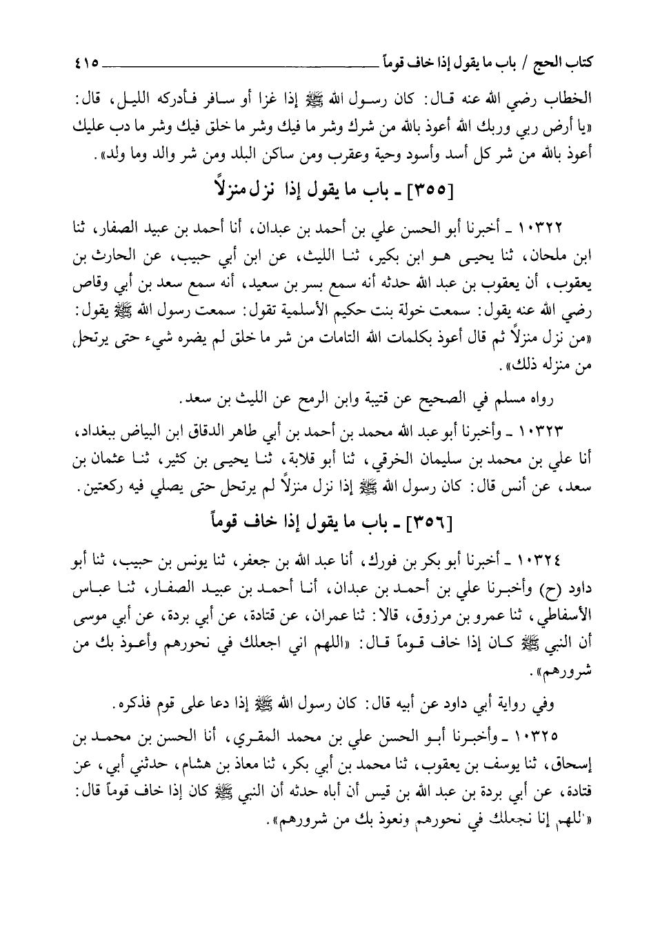 10325 - وَأَخْبَرَنَا أَبُو الْحَسَنِ عَلِيُّ بْنُ مُحَمَّدٍ الْمُقْرِئُ , أنا الْحَسَنُ بْنُ مُحَمَّدِ بْنِ إِسْحَاقَ , ثنا يُوسُفُ بْنُ يَعْقُوبَ , ثنا مُحَمَّدُ بْنُ أَبِي بَكْرٍ , ثنا مُعَاذُ بْنُ هِشَامٍ , حَدَّثَنِي أَبِي , عَنْ قَتَادَةَ , عَنْ أَبِي بُرْدَةَ بْنِ عَبْدِ اللهِ بْنِ قَيْسٍ أَنَّ أَبَاهُ , حَدَّثَهُ أَنَّ النَّبِيَّ صَلَّى اللهُ عَلَيْهِ وَسَلَّمَ كَانَ §إِذَا خَافَ قَوْمًا , قَالَ: " اللهُمَّ إِنَّا نَجْعَلُكَ فِي نُحُورِهِمْ , وَنَعُوذُ بِكَ مِنْ شُرُورِهِمْ "