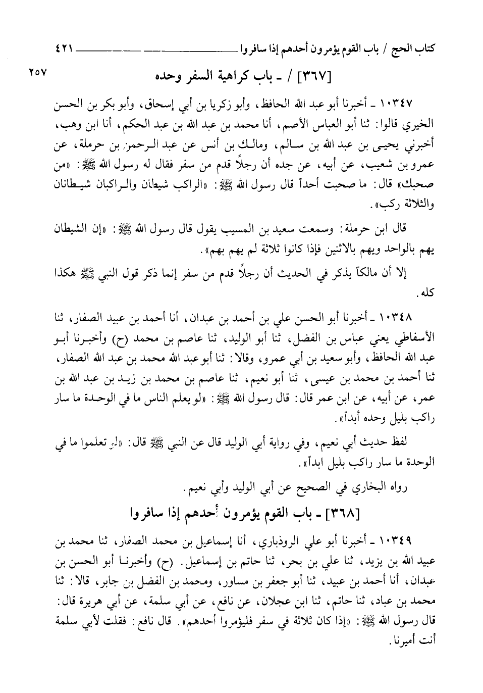 10347 - أَخْبَرَنَا أَبُو عَبْدِ اللهِ الْحَافِظُ , وَأَبُو زَكَرِيَّا بْنُ أَبِي إِسْحَاقَ , وَأَبُو بَكْرِ بْنُ الْحَسَنِ الْحِيرِيُّ , قَالُوا: ثنا أَبُو الْعَبَّاسِ الْأَصَمُّ , أنا مُحَمَّدُ بْنُ عَبْدِ اللهِ بْنِ عَبْدِ الْحَكَمِ , أنا ابْنُ وَهْبٍ , أَخْبَرَنِي يَحْيَى بْنُ عَبْدِ اللهِ بْنِ سَالِمٍ , وَمَالِكُ بْنُ أَنَسٍ , عَنْ عَبْدِ الرَّحْمَنِ بْنِ حَرْمَلَةَ , عَنْ عَمْرِو بْنِ شُعَيْبٍ , عَنْ أَبِيهِ , عَنْ جَدِّهِ أَنَّ رَجُلًا قَدِمَ مِنْ سَفَرٍ , فَقَالَ لَهُ رَسُولُ اللهِ صَلَّى اللهُ عَلَيْهِ وَسَلَّمَ: " مَنْ صَحِبَكَ؟ " قَالَ: مَا صَحِبْتُ أَحَدًا , قَالَ رَسُولُ اللهِ صَلَّى اللهُ عَلَيْهِ وَسَلَّمَ: §" الرَّاكِبُ شَيْطَانٌ وَالرَّاكِبَانِ شَيْطَانَانِ وَالثَّلَاثَةُ رَكْبٌ " قَالَ ابْنُ حَرْمَلَةَ: وَسَمِعْتُ سَعِيدَ بْنَ الْمُسَيِّبِ , يَقُولُ: قَالَ رَسُولُ اللهِ صَلَّى اللهُ عَلَيْهِ وَسَلَّمَ: " إِنَّ الشَّيْطَانَ يَهِمَّ بِالْوَاحِدِ , وَيَهِمُّ بِالِاثْنَيْنِ فَإِذَا كَانُوا ثَلَاثَةً لَمْ يَهِمَّ بِهِمْ " , إِلَّا أَنَّ مَالِكًا لَمْ يَذْكُرْ فِي الْحَدِيثِ أَنَّ رَجُلًا قَدِمَ مِنْ سَفَرٍ إِنَّمَا ذَكَرَ قَوْلَ النَّبِيِّ صَلَّى اللهُ عَلَيْهِ وَسَلَّمَ هَكَذَا كُلَّهُ