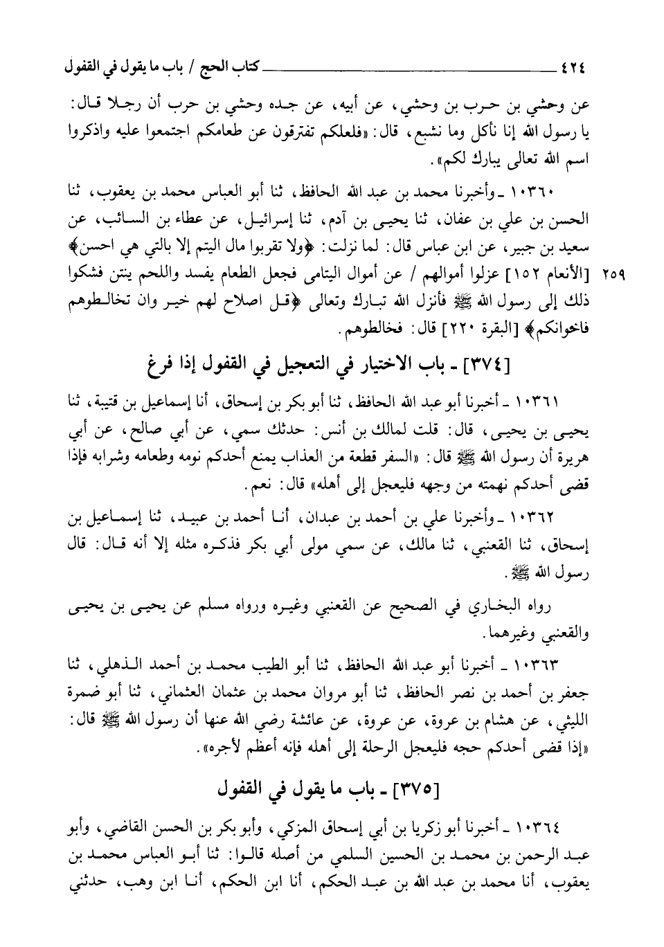 10363 - أَخْبَرَنَا أَبُو عَبْدِ اللهِ الْحَافِظُ , ثنا أَبُو الطَّيِّبِ مُحَمَّدُ بْنُ أَحْمَدَ الذُّهْلِيُّ , ثنا جَعْفَرُ بْنُ أَحْمَدَ بْنِ نَصْرٍ الْحَافِظُ , ثنا أَبُو مَرْوَانَ مُحَمَّدُ بْنُ عُثْمَانَ الْعُثْمَانِيُّ , ثنا أَبُو ضَمْرَةَ اللَّيْثِيُّ , عَنْ هِشَامِ بْنِ عُرْوَةَ , عَنْ عُرْوَةَ , عَنْ عَائِشَةَ , رَضِيَ اللهُ عَنْهَا أَنَّ رَسُولَ اللهِ صَلَّى اللهُ عَلَيْهِ وَسَلَّمَ , قَالَ: §" إِذَا قَضَى أَحَدُكُمْ حَجَّهُ فَلْيُعَجِّلِ الرِّحْلَةَ إِلَى أَهْلِهِ , فَإِنَّهُ أَعْظَمُ لِأَجْرِهِ "