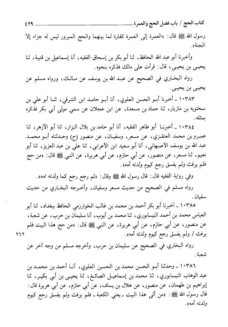 10384 - أَخْبَرَنَا أَبُو طَاهِرٍ الْفَقِيهُ , أنا أَبُو حَامِدِ بْنُ بِلَالٍ الْبَزَّارُ , ثنا أَبُو الْأَزْهَرِ , ثنا عَمْرُو بْنُ مُحَمَّدٍ الْعَنْقَزِيُّ , عَنْ مِسْعَرٍ , وَسُفْيَانَ , عَنْ مَنْصُورٍ , ح وَحَدَّثَنَاهُ أَبُو مُحَمَّدٍ عَبْدُ اللهِ بْنُ يُوسُفَ الْأَصْبَهَانِيُّ , أنا أَبُو سَعِيدِ بْنُ الْأَعْرَابِيِّ , ثنا عَلِيُّ بْنُ عَبْدِ الْعَزِيزِ , ثنا أَبُو نُعَيْمٍ , ثنا مِسْعَرٌ , عَنْ مَنْصُورٍ , عَنْ أَبِي حَازِمٍ , عَنْ أَبِي هُرَيْرَةَ , عَنِ النَّبِيِّ صَلَّى اللهُ عَلَيْهِ وَسَلَّمَ , قَالَ: §" مَنْ حَجَّ فَلَمْ يَرْفُثْ وَلَمْ يَفْسُقْ رَجَعَ كَيَوْمِ وَلَدَتْهُ أُمُّهُ " - وَفِي رِوَايَةِ الْفَقِيهِ , قَالَ: - قَالَ رَسُولُ اللهِ صَلَّى اللهُ عَلَيْهِ وَسَلَّمَ وَقَالَ: " ثُمَّ رَجَعَ رَجَعَ كَمَا وَلَدَتْهُ أُمُّهُ " رَوَاهُ مُسْلِمٌ فِي الصَّحِيحِ مِنْ حَدِيثِ مِسْعَرٍ , وَسُفْيَانَ , وَأَخْرَجَهُ الْبُخَارِيُّ مِنْ حَدِيثِ سُفْيَانَ