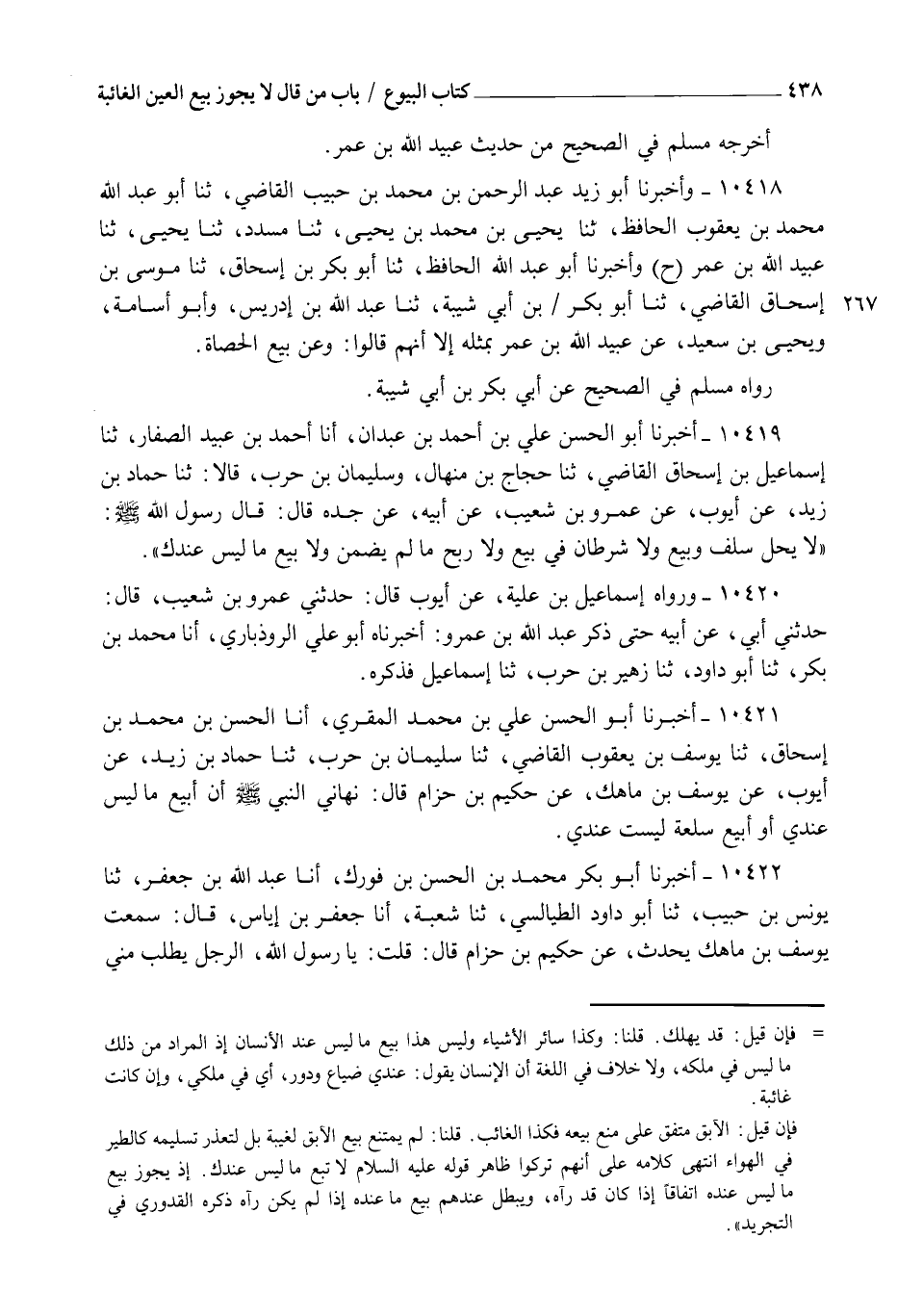 10421 - أَخْبَرَنَا أَبُو الْحَسَنِ عَلِيُّ بْنُ مُحَمَّدٍ الْمُقْرِئُ , أنا الْحَسَنُ بْنُ مُحَمَّدِ بْنِ إِسْحَاقَ , ثنا يُوسُفُ بْنُ يَعْقُوبَ الْقَاضِي , ثنا سُلَيْمَانُ بْنُ حَرْبٍ , ثنا حَمَّادُ بْنُ زَيْدٍ , عَنْ أَيُّوبَ , عَنْ يُوسُفَ بْنِ مَاهِكٍ , عَنْ حَكِيمِ بْنِ حِزَامٍ , قَالَ: §" نَهَانِي النَّبِيُّ صَلَّى اللهُ عَلَيْهِ وَسَلَّمَ أَنْ أَبِيعَ مَا لَيْسَ عِنْدِي , أَوْ أَبِيعَ سِلْعَةً لَيْسَتْ عِنْدِي "