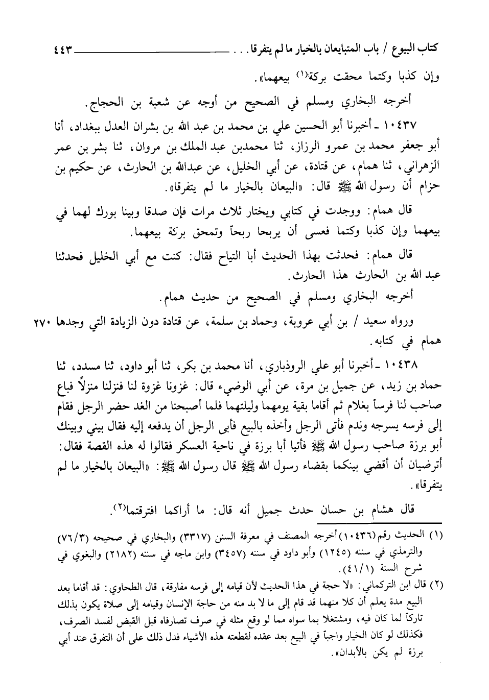 10437 - أَخْبَرَنَا أَبُو الْحُسَيْنِ عَلِيُّ بْنُ مُحَمَّدِ بْنِ عَبْدِ اللهِ بْنِ بِشْرَانَ الْعَدْلُ بِبَغْدَادَ , أنا أَبُو جَعْفَرٍ مُحَمَّدُ بْنُ عَمْرٍو الرَّزَّازُ , ثنا مُحَمَّدُ بْنُ عَبْدِ الْمَلِكِ بْنِ مَرْوَانَ , ثنا بِشْرُ بْنُ عُمَرَ الزَّهْرَانِيُّ , ثنا هَمَّامٌ , عَنْ قَتَادَةَ , عَنْ أَبِي الْخَلِيلِ , عَنْ عَبْدِ اللهِ بْنِ الْحَارِثِ , عَنْ حَكِيمِ بْنِ حِزَامٍ أَنَّ رَسُولَ اللهِ صَلَّى اللهُ عَلَيْهِ وَسَلَّمَ , قَالَ: " §الْبَيِّعَانِ بِالْخِيَارِ مَا لَمْ يَتَفَرَّقَا " - قَالَ هَمَّامٌ: وَوَجَدْتُ فِي كِتَابِي: - " وَيَخْتَارُ ثَلَاثَ مَرَّاتٍ فَإِنْ صَدَقَا وَبَيَّنَا بُورِكَ لَهُمَا فِي بَيْعِهِمَا , وَإِنْ كَذَبَا وَكَتَمَا فَعَسَى أَنْ يَرْبَحَا رِبْحًا وَتُمْحَقَ بَرَكَةُ بَيْعِهِمَا " قَالَ هَمَّامٌ: فَحَدَّثْتُ بِهَذَا الْحَدِيثِ أَبَا التَّيَّاحِ , فَقَالَ: كُنْتُ مَعَ أَبِي الْخَلِيلِ فَحَدَّثَنَا عَبْدُ اللهِ بْنُ الْحَارِثِ هَذَا الْحَارِثُ أَخْرَجَهُ الْبُخَارِيُّ وَمُسْلِمٌ فِي الصَّحِيحِ مِنْ حَدِيثِ هَمَّامٍ , وَرَوَاهُ سَعِيدُ بْنُ أَبِي عَرُوبَةَ , وَحَمَّادُ بْنُ سَلَمَةَ , عَنْ قَتَادَةَ دُونَ الزِّيَادَةِ الَّتِي وَجَدَهَا هَمَّامٌ فِي كِتَابِهِ