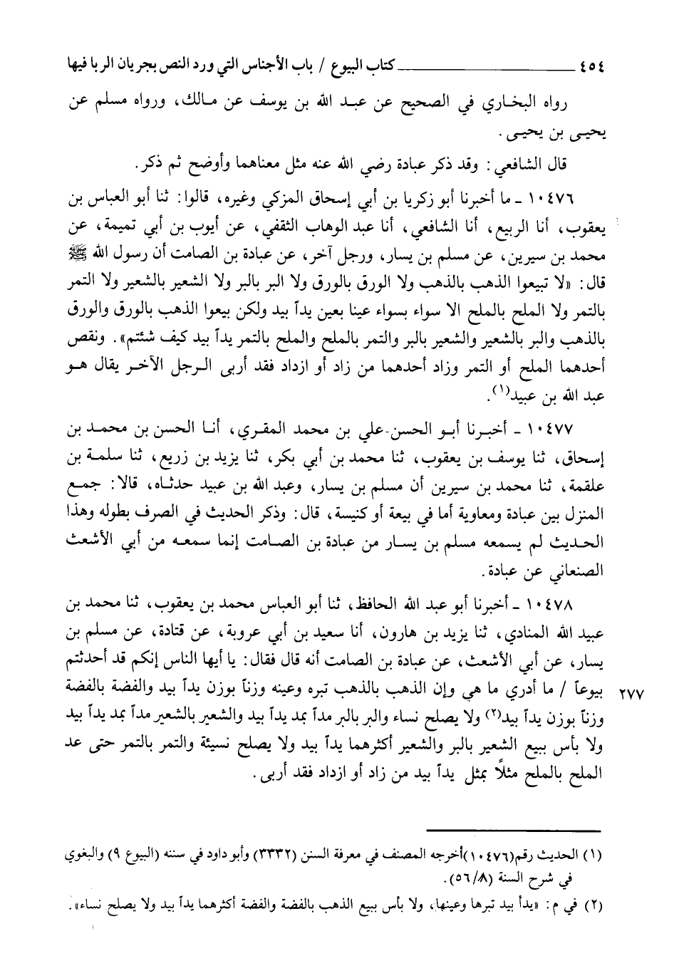 10476 - مَا أَخْبَرَنَا أَبُو زَكَرِيَّا بْنُ أَبِي إِسْحَاقَ الْمُزَكِّي , وَغَيْرُهُ , قَالُوا: ثنا أَبُو الْعَبَّاسِ بْنُ يَعْقُوبَ , أنا الرَّبِيعُ , أنا الشَّافِعِيُّ , أنا عَبْدُ الْوَهَّابِ الثَّقَفِيُّ , عَنْ أَيُّوبَ بْنِ أَبِي تَمِيمَةَ , عَنْ مُحَمَّدِ بْنِ سِيرِينَ , عَنْ مُسْلِمِ بْنِ يَسَارٍ , وَرَجُلٍ آخَرَ , عَنْ عُبَادَةَ بْنِ الصَّامِتِ أَنَّ رَسُولَ اللهِ صَلَّى اللهُ عَلَيْهِ وَسَلَّمَ , قَالَ: §" لَا تَبِيعُوا الذَّهَبَ بِالذَّهَبِ , وَلَا الْوَرِقَ بِالْوَرِقِ , وَلَا الْبُرَّ بِالْبُرِّ , وَلَا الشَّعِيرَ بِالشَّعِيرِ , وَلَا التَّمْرَ بِالتَّمْرِ , وَلَا الْمِلْحَ بِالْمِلْحِ إِلَّا سَوَاءً بِسَوَاءٍ عَيْنًا بِعَيْنٍ يَدًا بِيَدٍ , وَلَكِنْ بِيعُوا الذَّهَبَ بِالْوَرِقِ وَالْوَرِقَ بِالذَّهَبِ , وَالْبُرَّ بِالشَّعِيرِ , وَالشَّعِيرَ بِالْبُرِّ , وَالتَّمْرَ بِالْمِلْحِ , وَالْمِلْحَ بِالتَّمْرِ يَدًا بِيَدٍ كَيْفَ شِئْتُمْ " - وَنَقَصَ أَحَدُهُمَا -: " الْمِلْحَ أَوِ التَّمْرَ " - وَزَادَ أَحَدُهُمَا -: " مَنْ زَادَ أَوِ ازْدَادَ فَقَدْ أَرْبَى " الرَّجُلُ الْآخَرُ يُقَالُ هُوَ عَبْدُ اللهِ بْنُ عُبَيْدٍ.