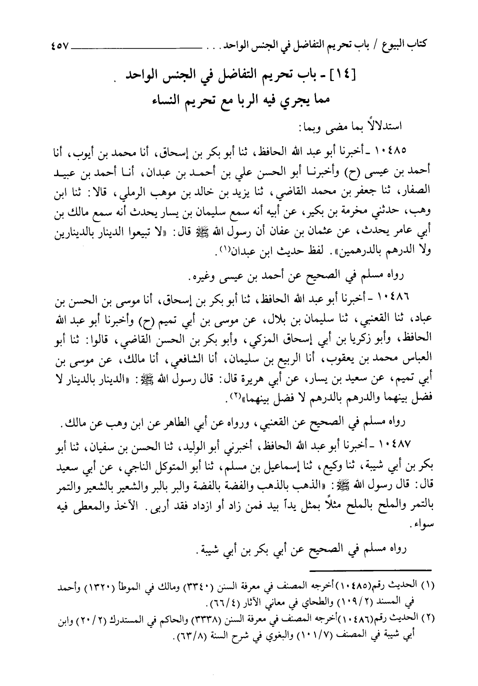 10485 - وَبِمَا أَخْبَرَنَا أَبُو عَبْدِ اللهِ الْحَافِظُ , ثنا أَبُو بَكْرِ بْنُ إِسْحَاقَ , أنا مُحَمَّدُ بْنُ أَيُّوبَ , أنا أَحْمَدُ بْنُ عِيسَى , ح وَأَخْبَرَنَا أَبُو الْحَسَنِ عَلِيُّ بْنُ أَحْمَدَ بْنِ عَبْدَانَ , أنا أَحْمَدُ بْنُ عُبَيْدٍ الصَّفَّارُ , ثنا جَعْفَرُ بْنُ مُحَمَّدٍ الْقَاضِي , ثنا يَزِيدُ بْنُ خَالِدِ بْنِ مَوْهَبٍ الرَّمْلِيُّ , قَالَا: ثنا ابْنُ وَهْبٍ , حَدَّثَنِي مَخْرَمَةُ بْنُ بُكَيْرٍ , عَنْ أَبِيهِ أَنَّهُ سَمِعَ سُلَيْمَانَ بْنَ يَسَارٍ يُحَدِّثُ أَنَّهُ سَمِعَ مَالِكَ بْنَ أَبِي عَامِرٍ يُحَدِّثُ , عَنْ عُثْمَانَ بْنِ عَفَّانَ أَنَّ رَسُولَ اللهِ صَلَّى اللهُ عَلَيْهِ وَسَلَّمَ , قَالَ: §" لَا تَبِيعُوا الدِّينَارَ بِالدِّينَارَيْنِ , وَلَا الدِّرْهَمَ بِالدِّرْهَمَيْنِ " لَفْظُ حَدِيثِ ابْنِ عَبْدَانَ رَوَاهُ مُسْلِمٌ فِي الصَّحِيحِ , عَنْ أَحْمَدَ بْنِ عِيسَى وَغَيْرِهِ
