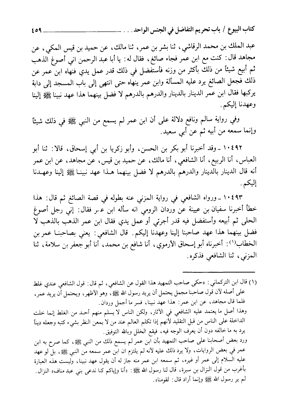 10493 - وَرَوَاهُ الشَّافِعِيُّ فِي رِوَايَةِ الْمُزَنِيِّ عَنْهُ بِطُولِهِ فِي قِصَّةِ الصَّائِغِ , ثُمَّ قَالَ: هَذَا خَطَأٌ , أَخْبَرَنَا سُفْيَانُ بْنُ عُيَيْنَةَ , عَنْ وَرْدَانَ الرُّومِيِّ أَنَّهُ سَأَلَ ابْنَ عُمَرَ , فَقَالَ: إِنِّي رَجُلٌ أَصُوغُ الْحُلِيَّ , ثُمَّ أَبِيعُهُ وَأَسْتَفْضِلُ فِيهِ قَدْرَ أُجْرَتِي , أَوْ عَمَلِ يَدِي , فَقَالَ ابْنُ عُمَرَ: §" الذَّهَبُ بِالذَّهَبِ لَا فَضْلَ بَيْنَهُمَا هَذَا عَهْدُ صَاحِبِنَا إِلَيْنَا وَعَهْدُنَا إِلَيْكُمْ " قَالَ الشَّافِعِيُّ: يَعْنِي بِصَاحِبِنَا عُمَرَ بْنِ الْخَطَّابِ أَخْبَرَنَاهُ أَبُو إِسْحَاقَ الْأَرْمَوِيُّ , أنا شَافِعُ بْنُ مُحَمَّدٍ , أنا أَبُو جَعْفَرِ بْنُ سَلَامَةَ , ثنا الْمُزَنِيُّ , ثنا الشَّافِعِيُّ فَذَكَرَهُ