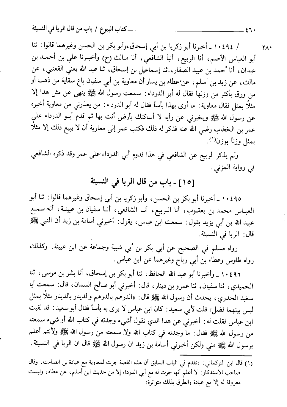 10495 - أَخْبَرَنَا أَبُو بَكْرِ بْنُ الْحَسَنِ , وَأَبُو زَكَرِيَّا بْنُ أَبِي إِسْحَاقَ وَغَيْرُهُمَا , قَالُوا: ثنا أَبُو الْعَبَّاسِ مُحَمَّدُ بْنُ يَعْقُوبَ , أنا الرَّبِيعُ , أنا الشَّافِعِيُّ , أنا سُفْيَانُ بْنُ عُيَيْنَةَ أَنَّهُ سَمِعَ عُبَيْدَ اللهِ بْنَ أَبِي يَزِيدَ , يَقُولُ: سَمِعْتُ ابْنَ عَبَّاسٍ , يَقُولُ: أَخْبَرَنِي أُسَامَةُ بْنُ زَيْدٍ أَنَّ النَّبِيَّ صَلَّى اللهُ عَلَيْهِ وَسَلَّمَ , قَالَ: §" الرِّبَا فِي النَّسِيئَةِ " رَوَاهُ مُسْلِمٌ فِي الصَّحِيحِ عَنْ أَبِي بَكْرِ بْنِ أَبِي شَيْبَةَ وَجَمَاعَةٍ , عَنِ ابْنِ عُيَيْنَةَ , وَكَذَلِكَ رَوَاهُ طَاوُسٌ , وَعَطَاءُ بْنُ أَبِي رَبَاحٍ وَغَيْرُهُمَا , عَنِ ابْنِ عَبَّاسٍ