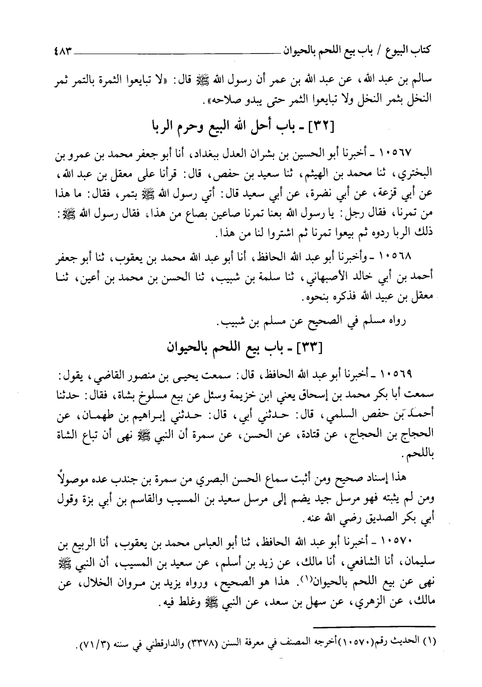 10570 - أَخْبَرَنَا أَبُو عَبْدِ اللهِ الْحَافِظُ , ثنا أَبُو الْعَبَّاسِ مُحَمَّدُ بْنُ يَعْقُوبَ , أنا الرَّبِيعُ بْنُ سُلَيْمَانَ , أنا الشَّافِعِيُّ , أنا مَالِكٌ , عَنْ زَيْدِ بْنِ أَسْلَمَ , عَنْ سَعِيدِ بْنِ الْمُسَيِّبِ " أَنَّ النَّبِيَّ صَلَّى اللهُ عَلَيْهِ وَسَلَّمَ §نَهَى عَنْ بَيْعِ اللَّحْمِ بِالْحَيَوَانِ " هَذَا هُوَ الصَّحِيحُ , وَرَوَاهُ يَزِيدُ بْنُ مَرْوَانَ الْخَلَّالُ , عَنْ مَالِكٍ , عَنِ الزُّهْرِيِّ , عَنْ سَهْلِ بْنِ سَعْدٍ , عَنِ النَّبِيِّ صَلَّى اللهُ عَلَيْهِ وَسَلَّمَ وَغَلَطَ فِيهِ