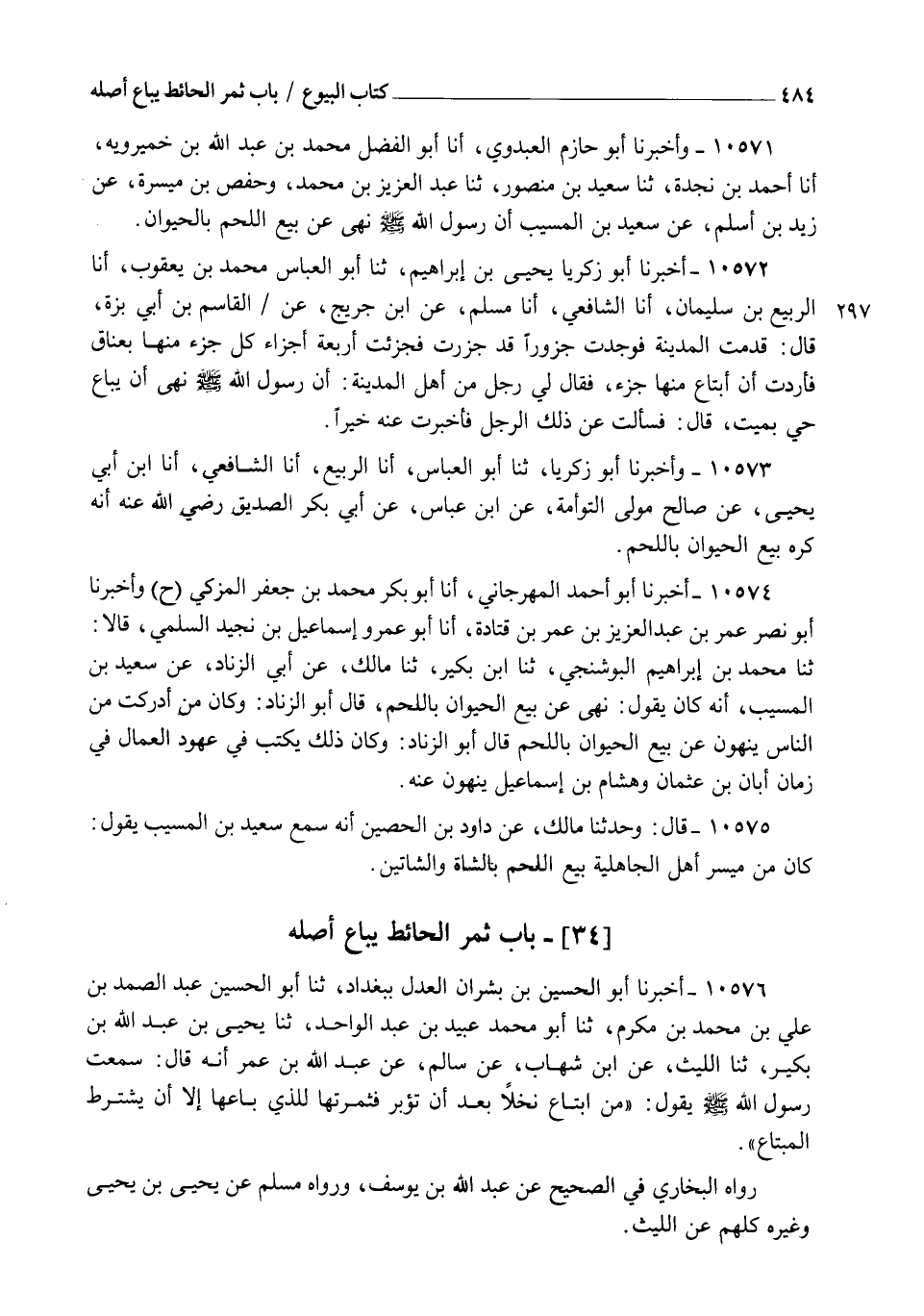 10574 - أَخْبَرَنَا أَبُو أَحْمَدَ الْمِهْرَجَانِيُّ , أنا أَبُو بَكْرٍ مُحَمَّدُ بْنُ جَعْفَرٍ الْمُزَكِّي ح وَأَخْبَرَنَا أَبُو نَصْرٍ عُمَرُ بْنُ عَبْدِ الْعَزِيزِ بْنِ عُمَرَ بْنِ قَتَادَةَ , أنا أَبُو عَمْرٍو إِسْمَاعِيلُ بْنُ نُجَيْدٍ السُّلَمِيُّ قَالَا: ثنا مُحَمَّدُ بْنُ إِبْرَاهِيمَ الْبُوشَنْجِيُّ , ثنا ابْنُ بُكَيْرٍ , ثنا مَالِكٌ , عَنْ أَبِي الزِّنَادِ , عَنْ سَعِيدِ بْنِ الْمُسَيِّبِ أَنَّهُ كَانَ يَقُولُ: " نُهِيَ §عَنْ بَيْعِ الْحَيَوَانِ بِاللَّحْمِ " قَالَ أَبُو الزِّنَادِ: وَكَانَ مَنْ أَدْرَكْتُ مِنَ النَّاسِ يَنْهَوْنَ عَنْ بَيْعِ الْحَيَوَانِ بِاللَّحْمِ , قَالَ أَبُو الزِّنَادِ: وَكَانَ ذَلِكَ يُكْتَبُ فِي عُهُودِ الْعُمَّالِ فِي زَمَانِ أَبَانَ بْنِ عُثْمَانَ , وَهِشَامِ بْنِ إِسْمَاعِيلَ يَنْهَوْنَ عَنْهُ
