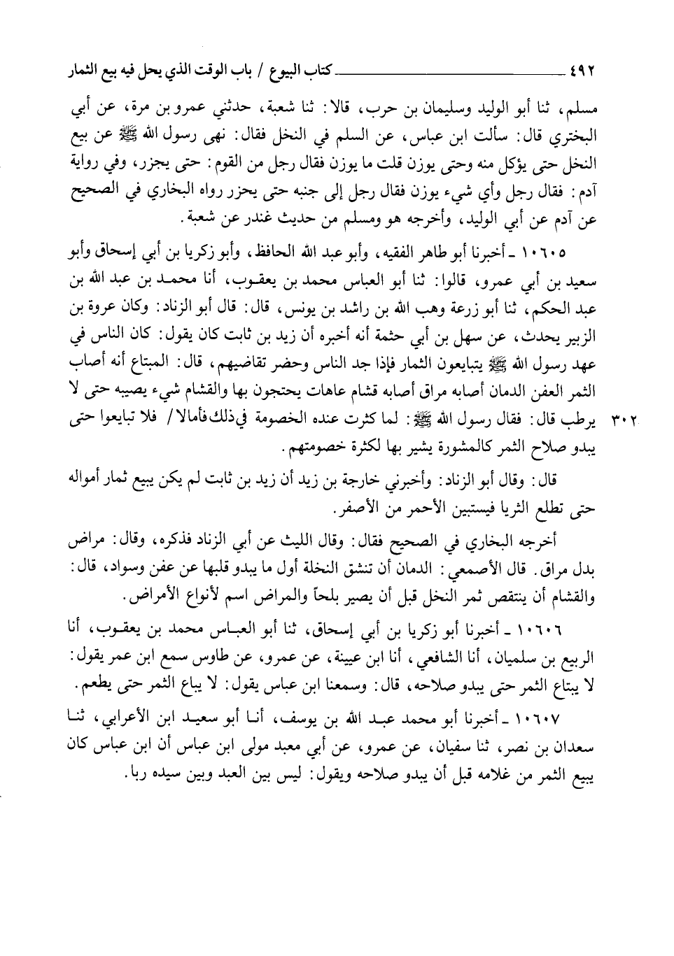 10605 - أَخْبَرَنَا أَبُو طَاهِرٍ الْفَقِيهُ , وَأَبُو عَبْدِ اللهِ الْحَافِظُ , وَأَبُو زَكَرِيَّا بْنُ أَبِي إِسْحَاقَ وَأَبُو سَعِيدِ بْنُ أَبِي عَمْرٍو , قَالُوا: ثنا أَبُو الْعَبَّاسِ مُحَمَّدُ بْنُ يَعْقُوبَ , أنا مُحَمَّدُ بْنُ عَبْدِ اللهِ بْنِ عَبْدِ الْحَكَمِ , ثنا أَبُو زُرْعَةَ وَهْبُ اللهِ بْنُ رَاشِدِ، عَنْ يُونُسَ , قَالَ: قَالَ أَبُو الزِّنَادِ: وَكَانَ عُرْوَةُ بْنُ الزُّبَيْرِ يُحَدِّثُ عَنْ سَهْلِ بْنِ أَبِي حَثْمَةَ أَنَّهُ أَخْبَرَهُ أَنَّ زَيْدَ بْنَ ثَابِتٍ كَانَ يَقُولُ: كَانَ النَّاسُ فِي عَهْدِ رَسُولِ اللهِ صَلَّى اللهُ عَلَيْهِ وَسَلَّمَ يَتَبَايَعُونَ الثِّمَارَ فَإِذَا جَدَّ النَّاسُ وَحَضَرَ تَقَاضِيهِمْ , قَالَ الْمُبْتَاعُ: إِنَّهُ أَصَابَ الثَّمَرَ الْعَفَنُ الدُّمَانُ , أَصَابَهُ مَرَاقٌ , أَصَابَهُ قُشَامٌ , عَاهَاتٌ يَحْتَجُّونَ بِهَا , وَالْقُشَامُ شَيْءٌ يُصِيبُهُ حَتَّى لَا يَرْطَبَ , قَالَ: فَقَالَ رَسُولُ اللهِ صَلَّى اللهُ عَلَيْهِ وَسَلَّمَ لَمَّا كَثُرَتْ عِنْدَهُ الْخُصُومَةُ فِي ذَلِكَ: " فَأَمَّا لَا §فَلَا تَبَايَعُوا حَتَّى يَبْدُوَ صَلَاحُ الثَّمَرِ " كَالْمَشُورَةِ يُشِيرُ بِهَا؛ لِكَثْرَةِ خُصُومَتِهِمْ , قَالَ: وَقَالَ أَبُو الزِّنَادِ: وَأَخْبَرَنِي خَارِجَةُ بْنُ زَيْدٍ أَنَّ زَيْدَ بْنَ ثَابِتٍ لَمْ يَكُنْ يَبِيعُ ثِمَارَ أَمْوَالِهِ حَتَّى تَطْلُعَ الثُّرَيَّا فَيَسْتَبِينَ الْأَحْمَرُ مِنَ الْأَصْفَرِ , أَخْرَجَهُ الْبُخَارِيُّ فِي الصَّحِيحِ فَقَالَ: وَقَالَ اللَّيْثُ , عَنْ أَبِي الزِّنَادِ فَذَكَرَهُ , وَقَالَ: مُرَاضٌ بَدَلَ مَرَاقٍ , قَالَ الْأَصْمَعِيُّ: الدُّمَانُ: أَنْ تَنْشَقَّ النَّخْلَةُ أَوَّلَ مَا يَبْدُو قَلْبُهَا عَنْ عَفَنٍ وَسَوَادٍ , قَالَ: وَالْقُشَامُ أَنْ يُنْتَقَصَ ثَمَرُ النَّخْلِ قَبْلَ أَنْ يَصِيرَ بَلَحًا , وَالْمُرَاضُ: اسْمٌ لِأَنْوَاعِ الْأَمْرَاضِ